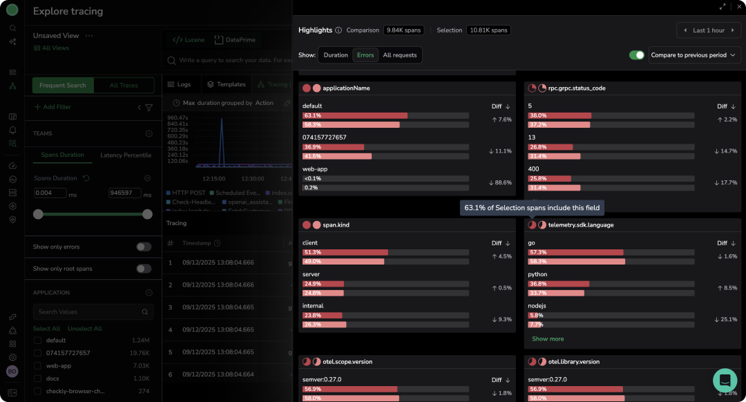 Highlights excels at surfacing which fields dominate during error spikes, helping you find the fastest path to root cause.