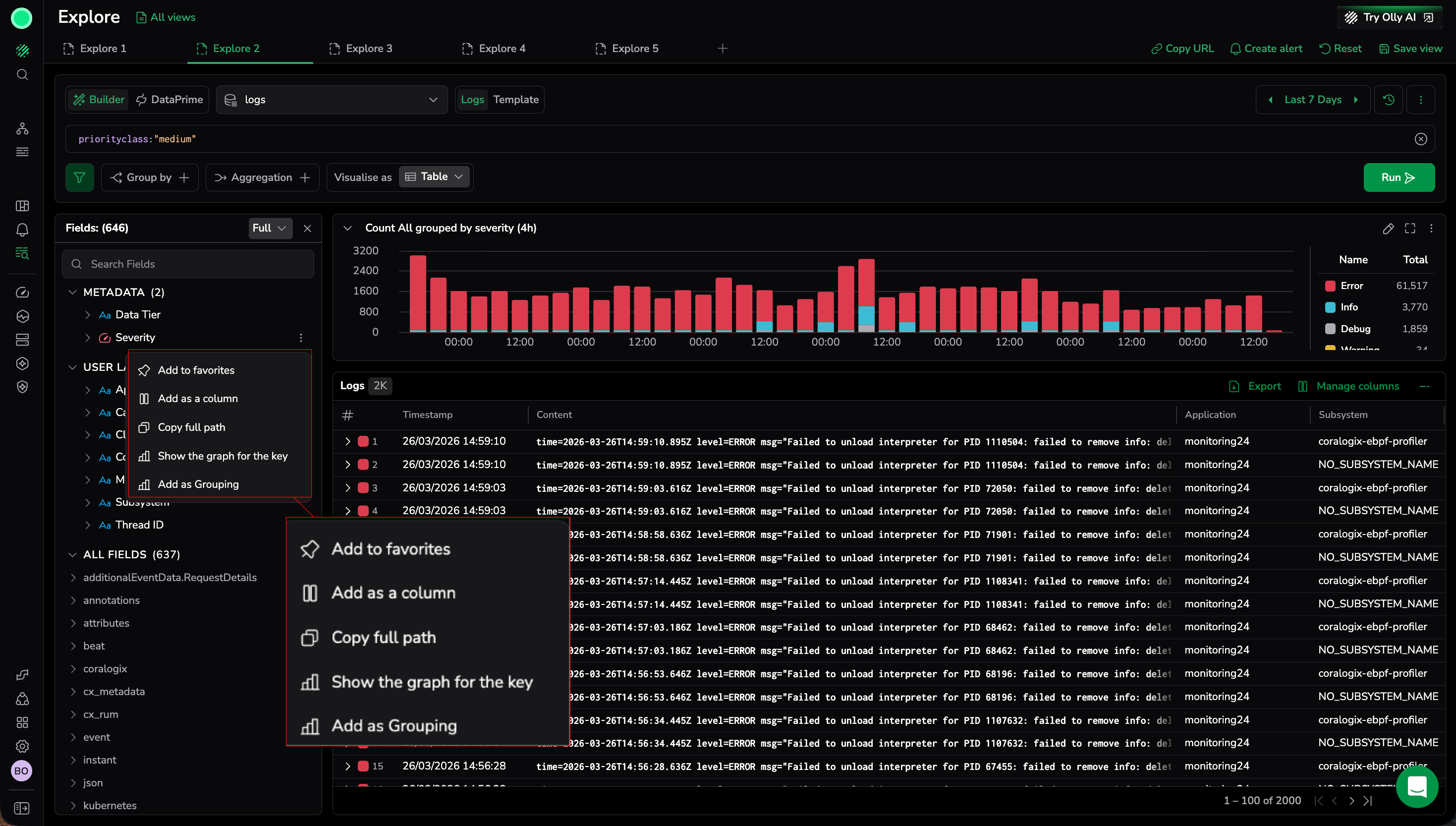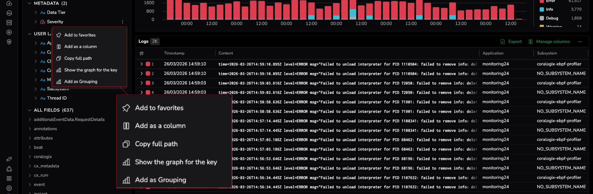 - The logs table context menu (right-click any key-value pair in a log entry that contains log data)