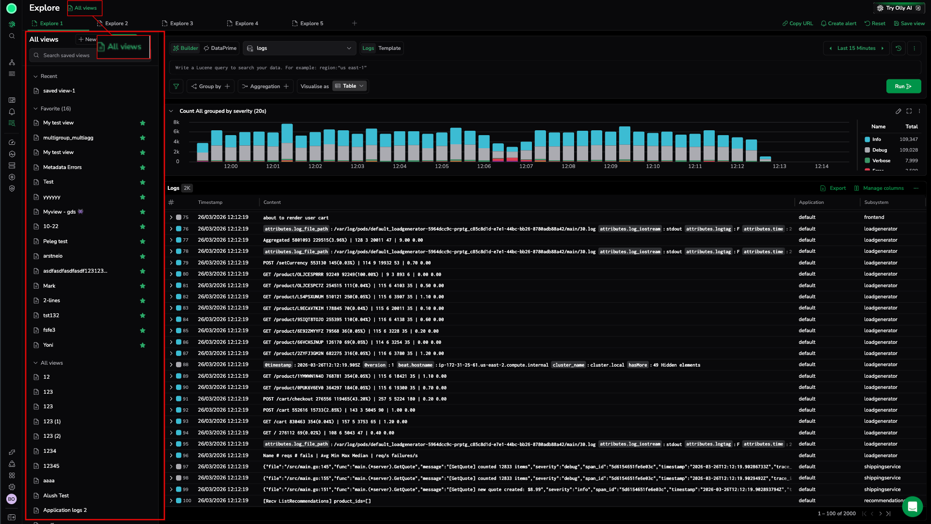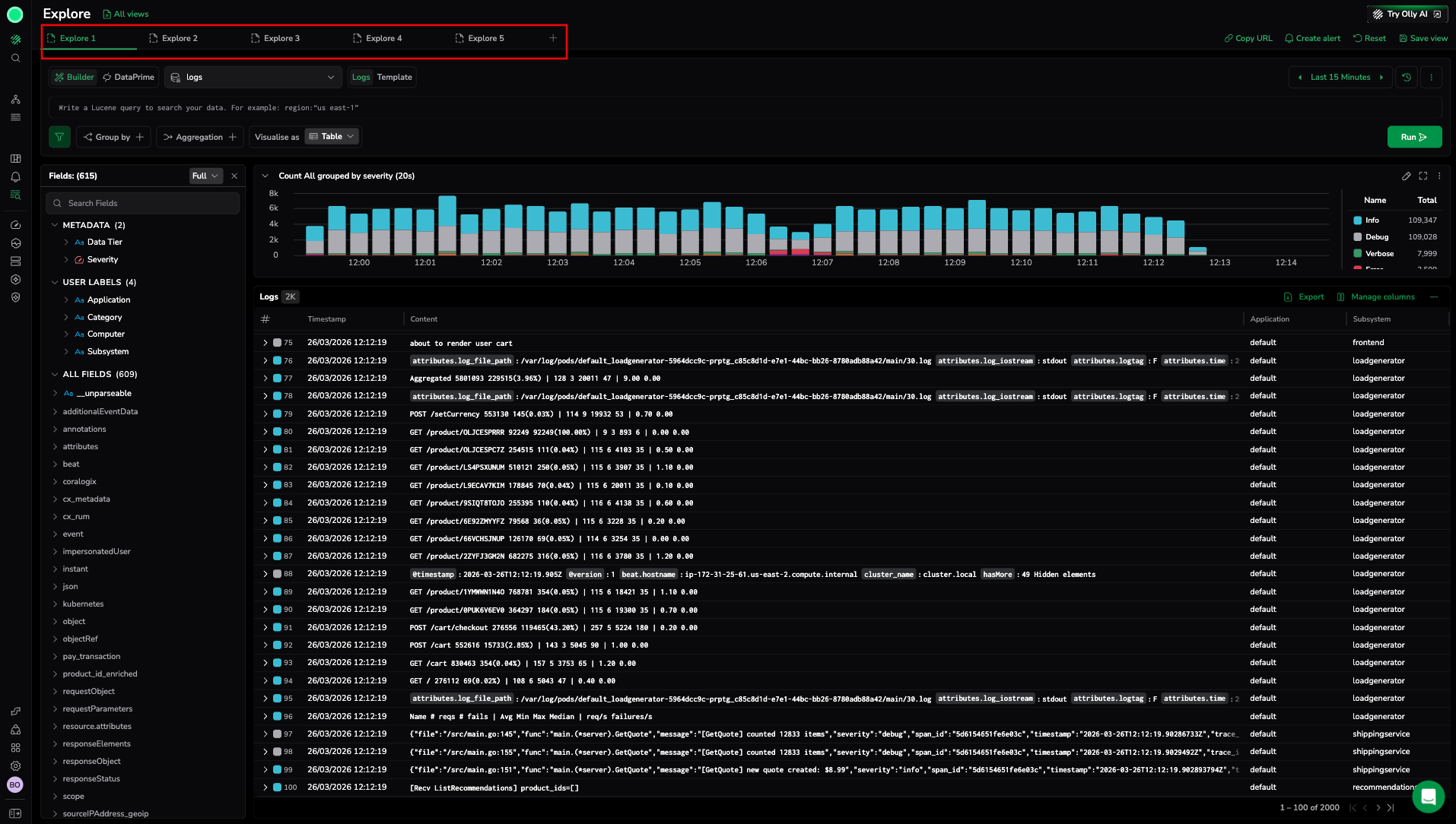 - Compare log volume across two different services during the same time window.