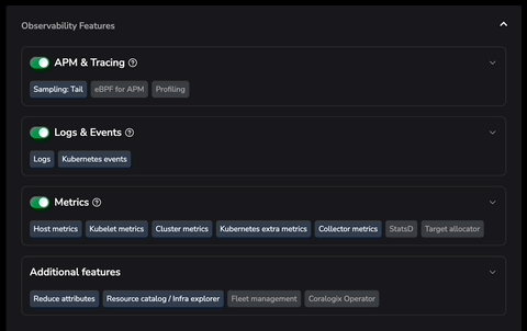 Select the features you want to deploy (APM, Logs, Metrics, eBPF, and others).