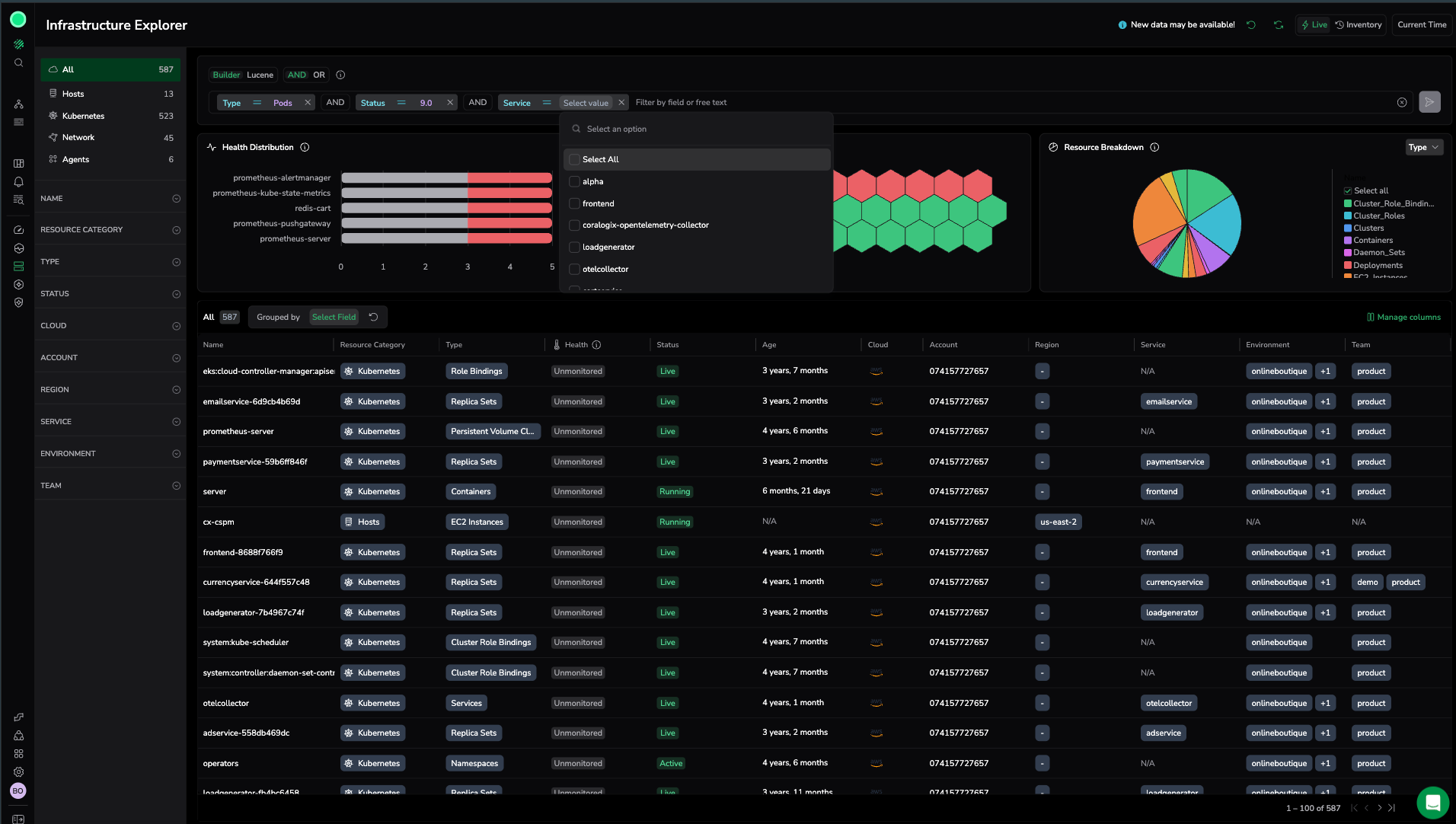 - Select a field, for example, Name, Resource Category, Type, Status, Cloud, Region, Service, Environment, or Team.