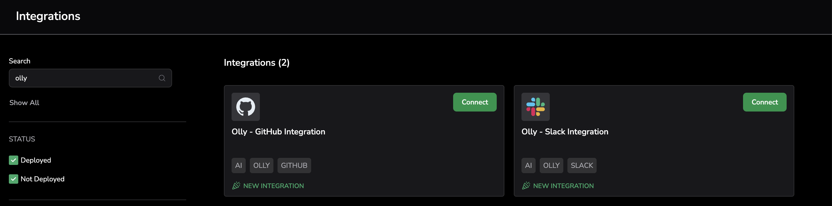 - Currently, Olly supports one GitHub integration per organization.