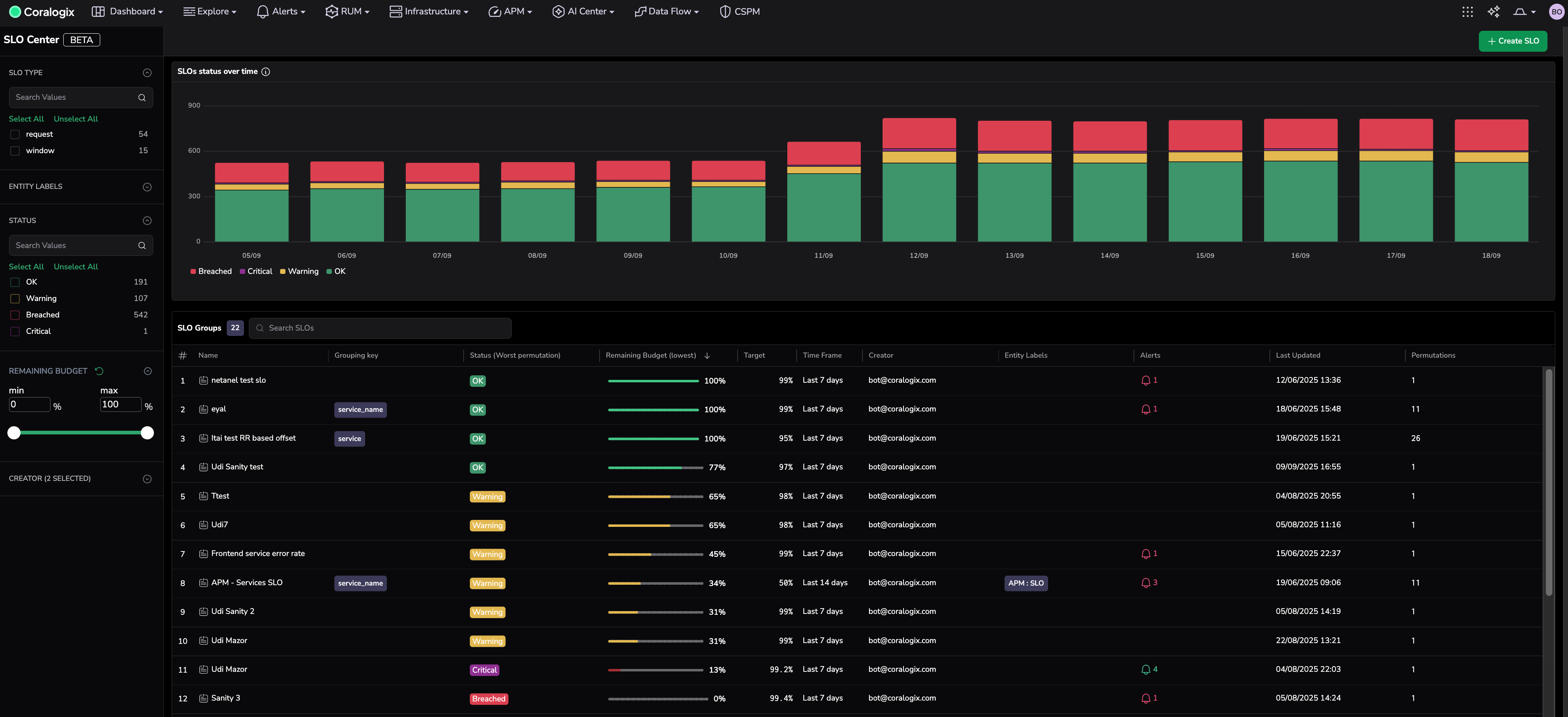 The SLO Center is the centralized dashboard for tracking and managing Service Level Objectives across your environment. It helps you stay on top of system reliability with clear visuals, real-time status, and actionable insights.