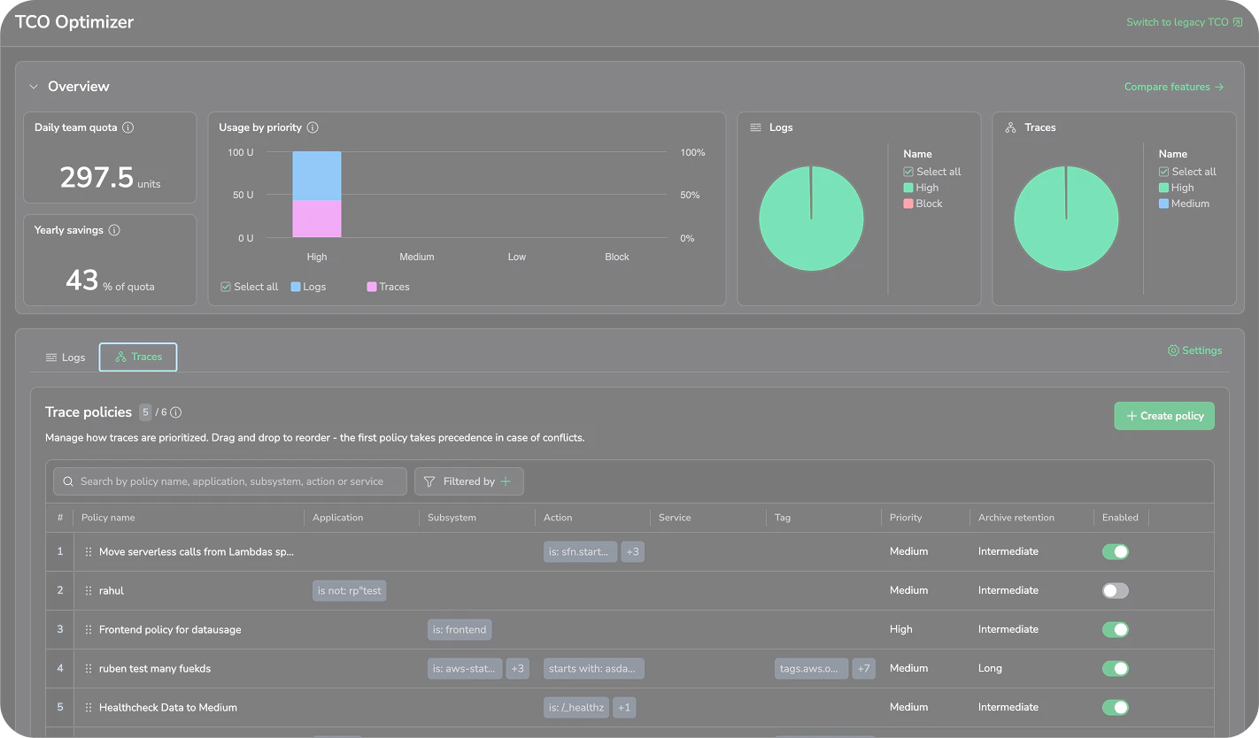Monitor observability usage across logs, metrics, traces, and more. Break usage down by entity type, TCO priority, and timeframe to understand trends, investigate anomalies, and support cost planning.