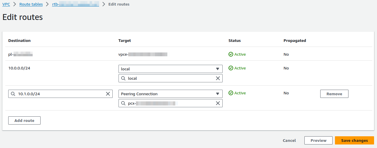 Repeat the routing configuration for the same-region VPC:
