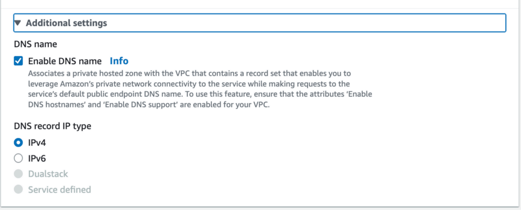 Select Enable DNS name to enable private DNS names for the endpoint. This allows Coralogix private FQDNs (for example, ingress.private.<your-domain>) to resolve to the private IP addresses of the endpoint network interfaces (ENIs) inside your VPC.