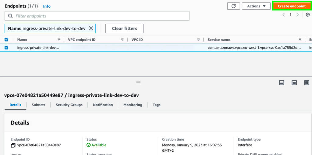 The endpoint status initially appears as Pending. Once the status changes to Available, validate connectivity using one of the following methods.
