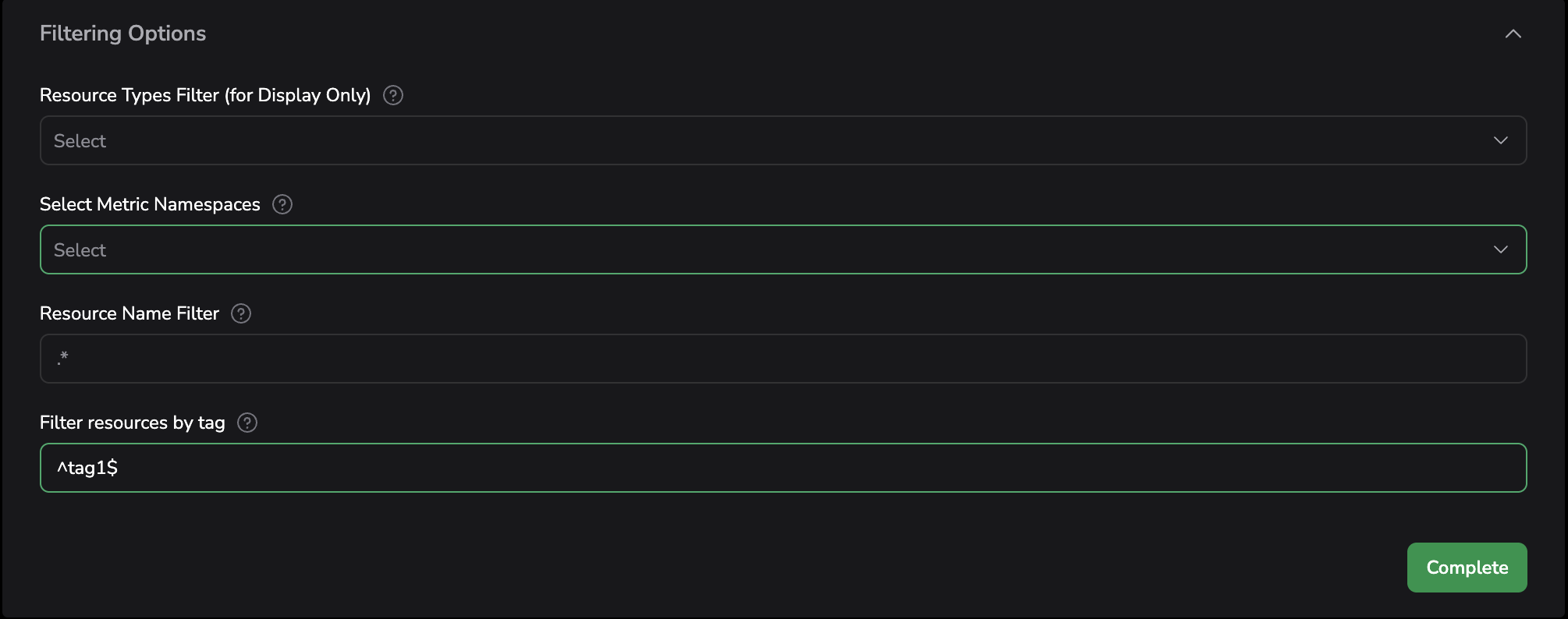 tagortag:regexform. If only a tag is given, resources having this tag will match the condition. If a RegEx is give, the tag value must match the RegEx. Each condition can be inverted by prepending a!. Metrics will be collected only for the resources matching all conditions. Examples:env:(?)^prod$, !testing