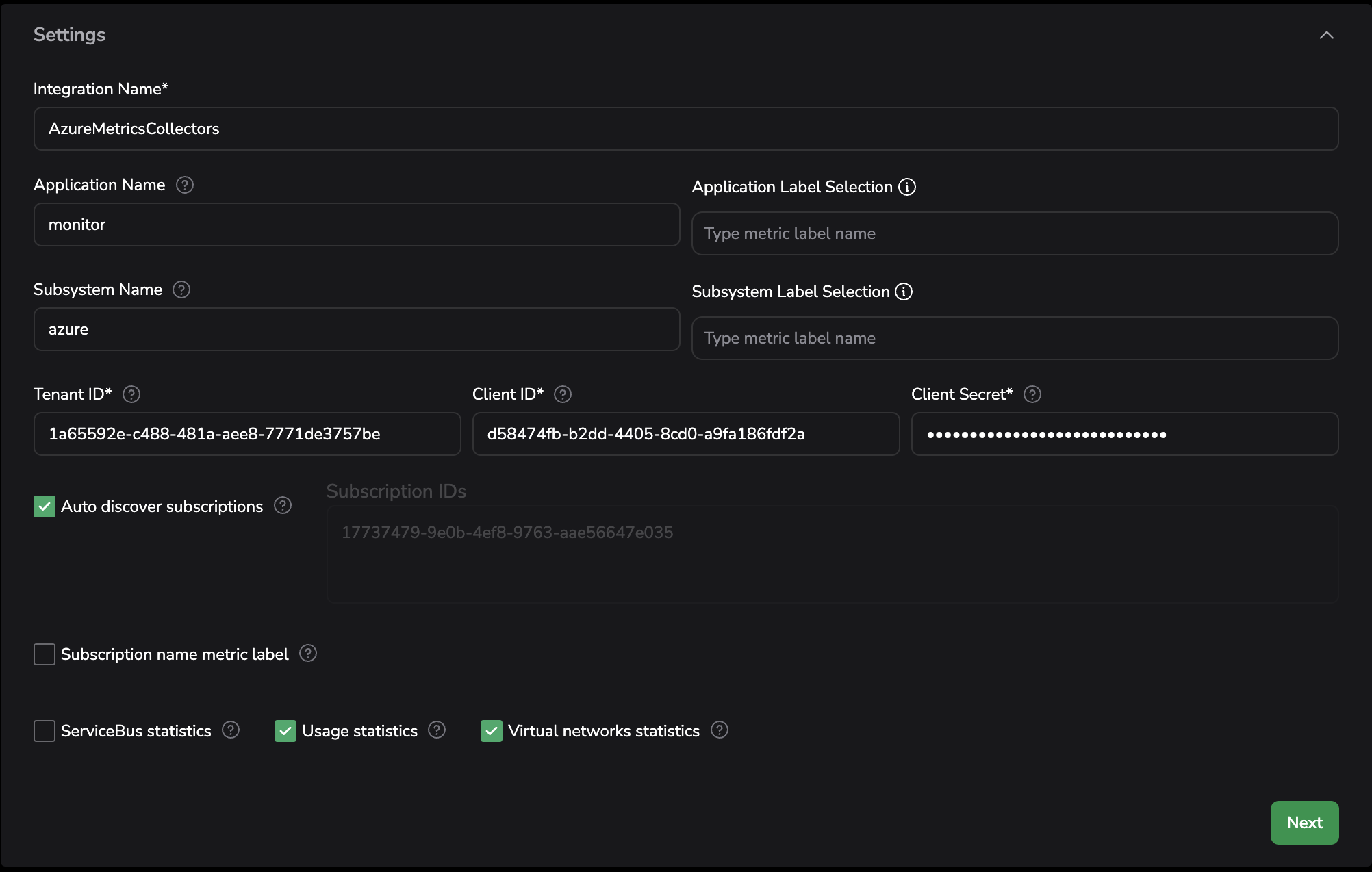 subscription_namecontaining the subscription name. Note that this is different from the subscription ID, which is always added ascloud_account_id.If needed, select the ServiceBus statistics, Usage statistics and/or Virtual networks statistics checkboxes to create metrics from: