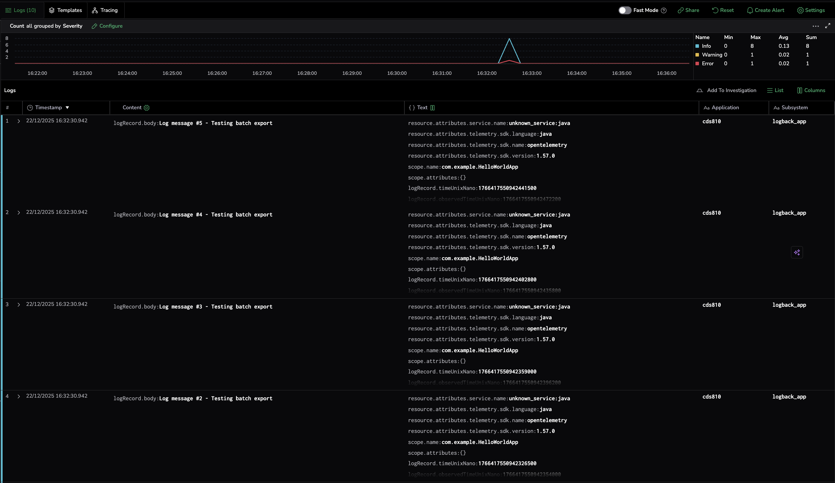 Once we configure the environment variables, setting it to the Coralogix OpenTelemetry endpoint with authentication header, application and subsystem name, we should be able to see application logs coming to Coralogix.