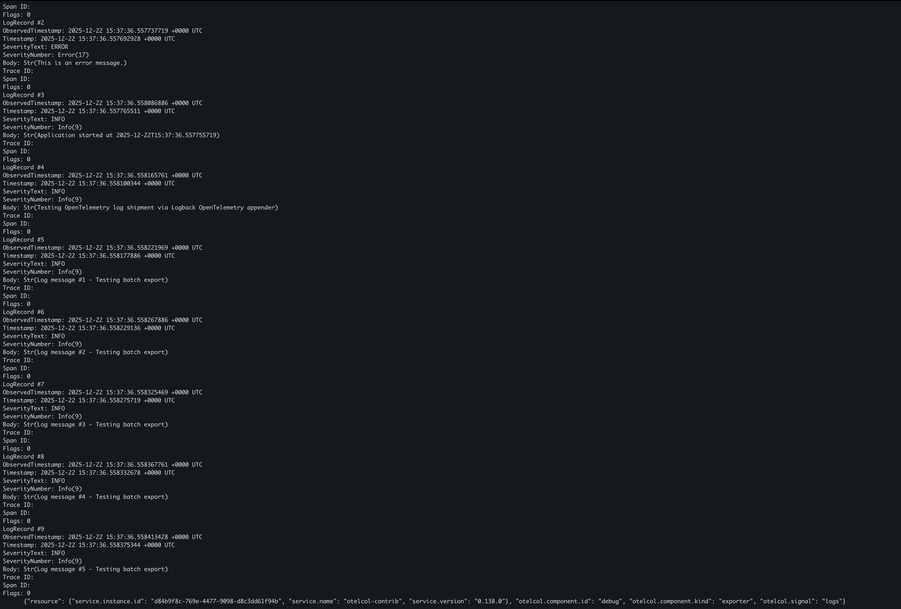 Once we configure the environment variable OTEL_EXPORTER_OTLP_ENDPOINT, setting it to the OpenTelemetry collector's endpoint, we should be able to see application logs coming to the target collector, from where we can also send logs to Coralogix.