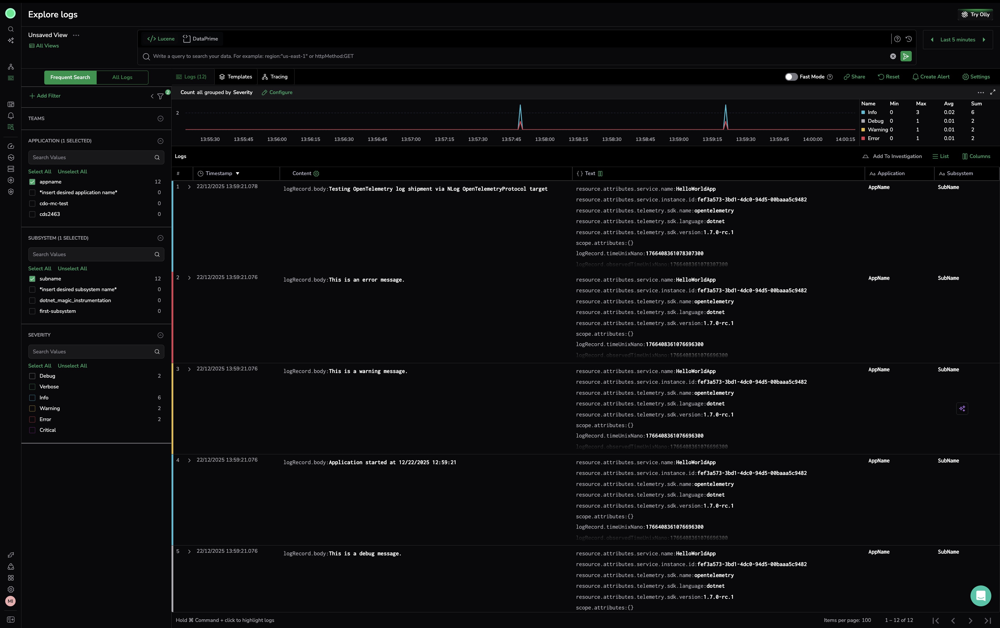 Once we configure the environment variables, setting it to the Coralogix OpenTelemetry endpoint with authentication header, application and subsystem name, we should be able to see application logs coming to Coralogix.
