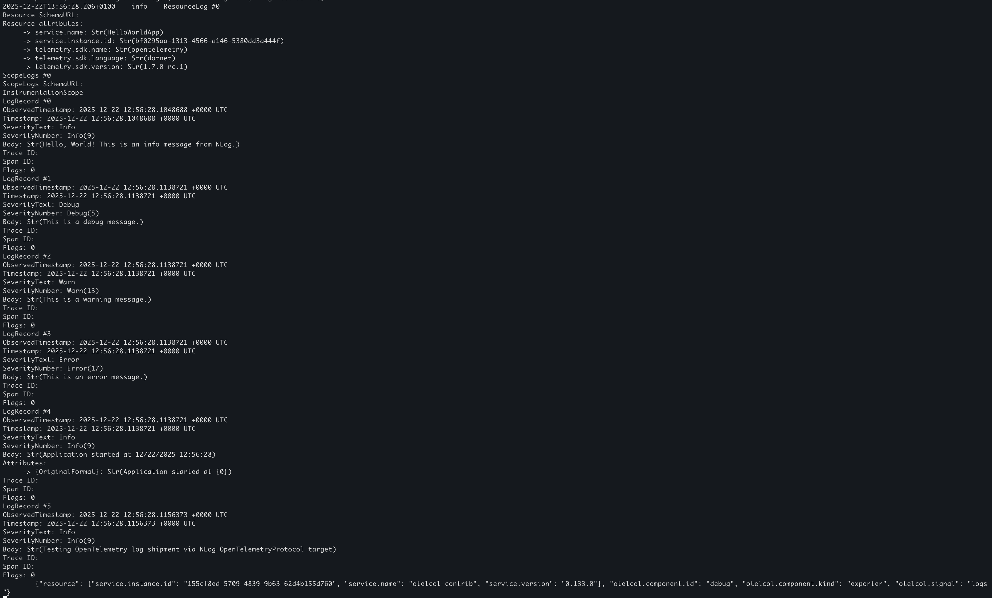 Console.WriteLine("Logging complete. Check your OpenTelemetry collector for the logs.");