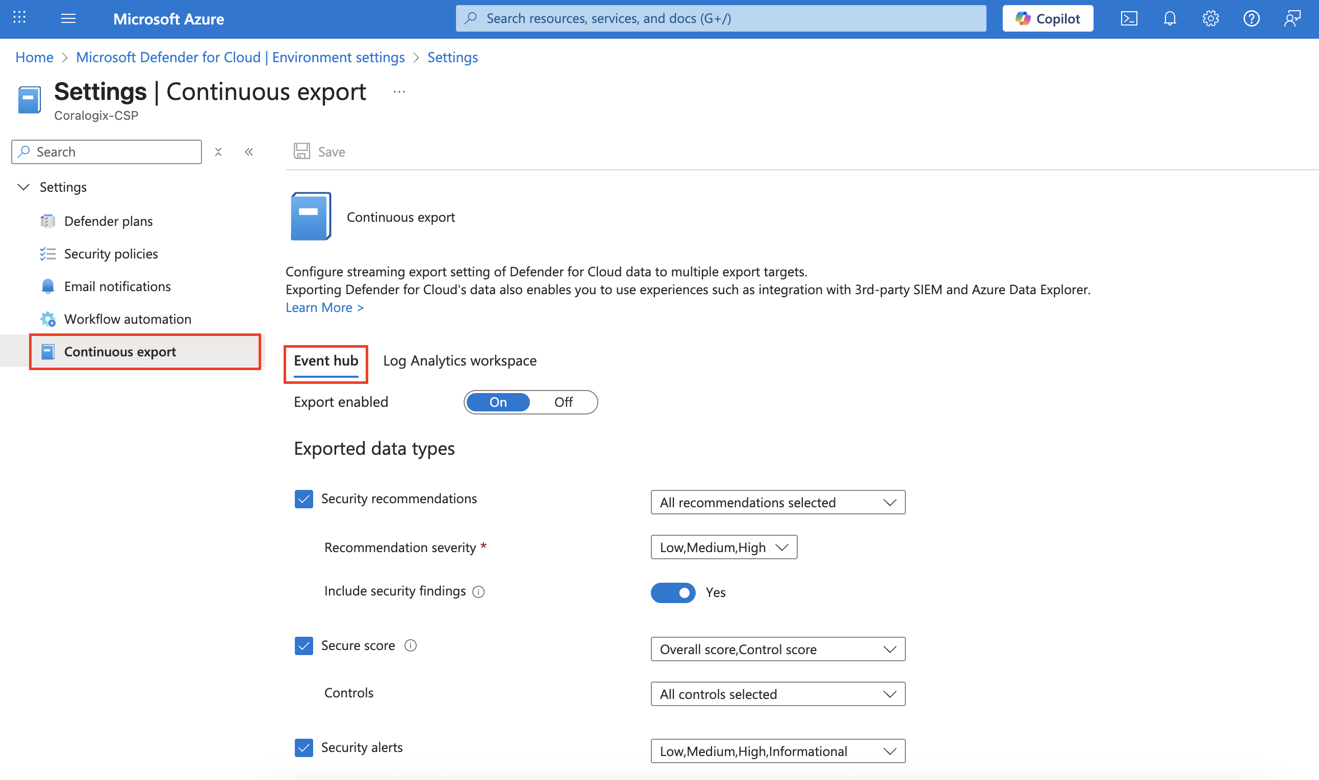 Step 2 — Export from Defender for Cloud → Event Hubs