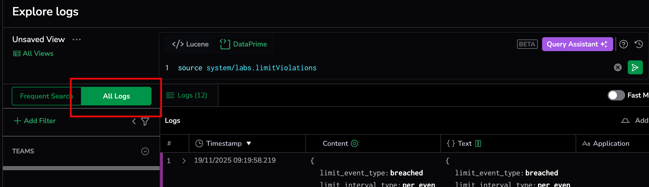 Diagnostic logs from the 'labs.limitViolations' dataset appear only when you filter logs explorer to All Logs.The Frequent Search filter hides dataset-backed logs. In addition, datasets cannot be queried with Lucene, you must use DataPrime. Switch to All Logs and use DataPrime to view violation logs.
