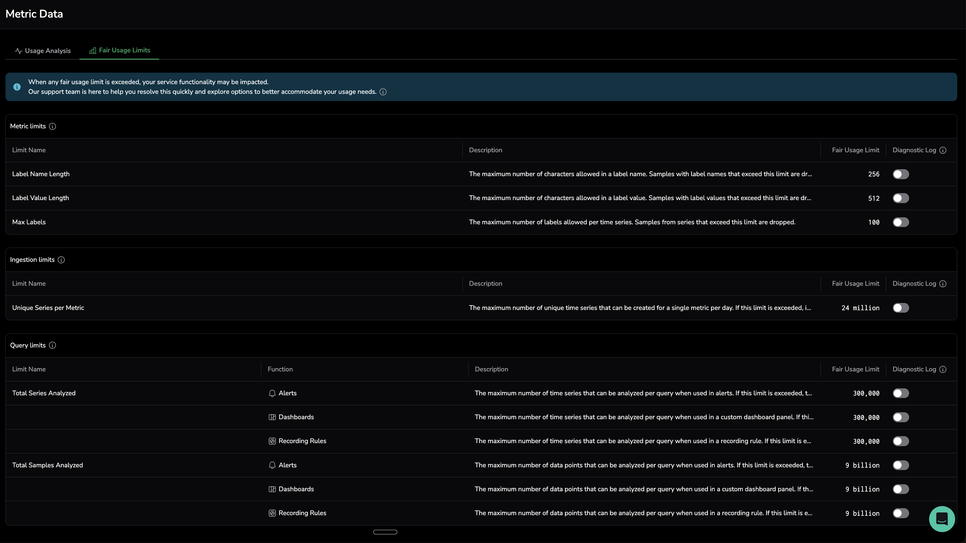 The Fair Usage Limits page displays all monitored limits grouped by category metric limits, ingestion limits, and query limits.