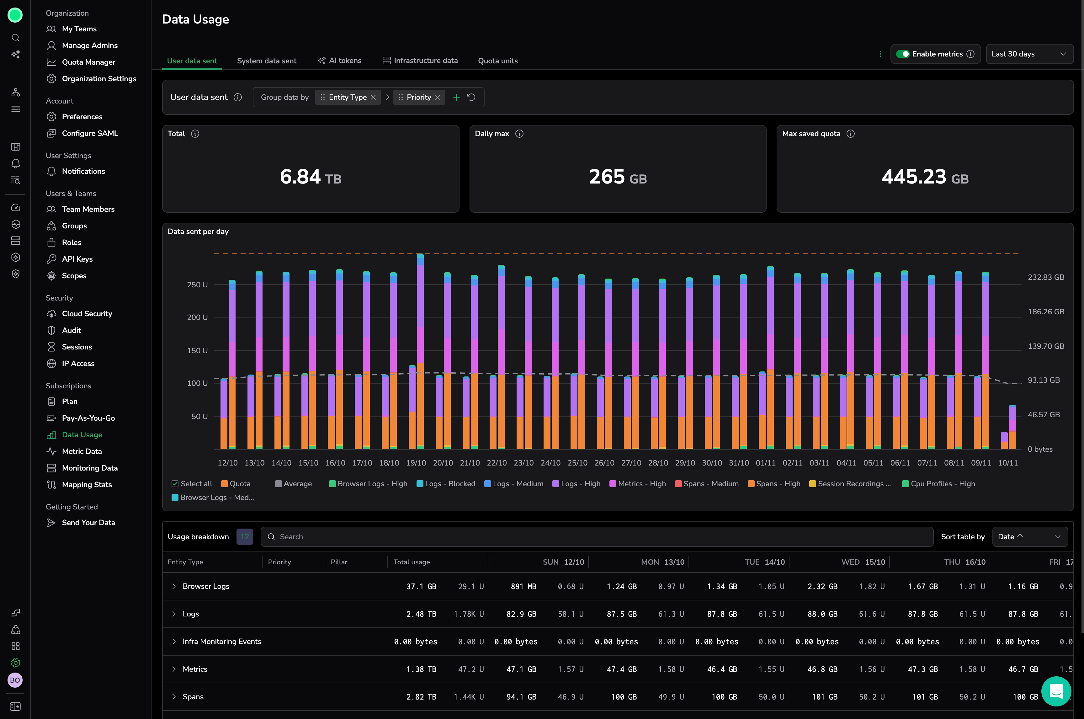 Enable Data Usage Metrics to view real-time usage patterns. Build dashboards, set alerts, and generate summaries.
