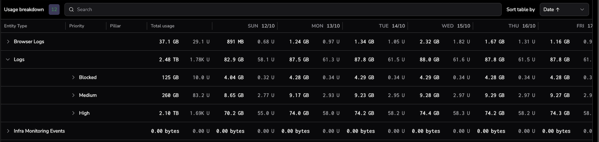 View all ingested data by pipeline for the current month, past 30 days, or past 90 days. Reports show policy-level, day-by-day ingestion by entity type and TCO priority. Reports are available in the interface or via the Data Usage Service API.