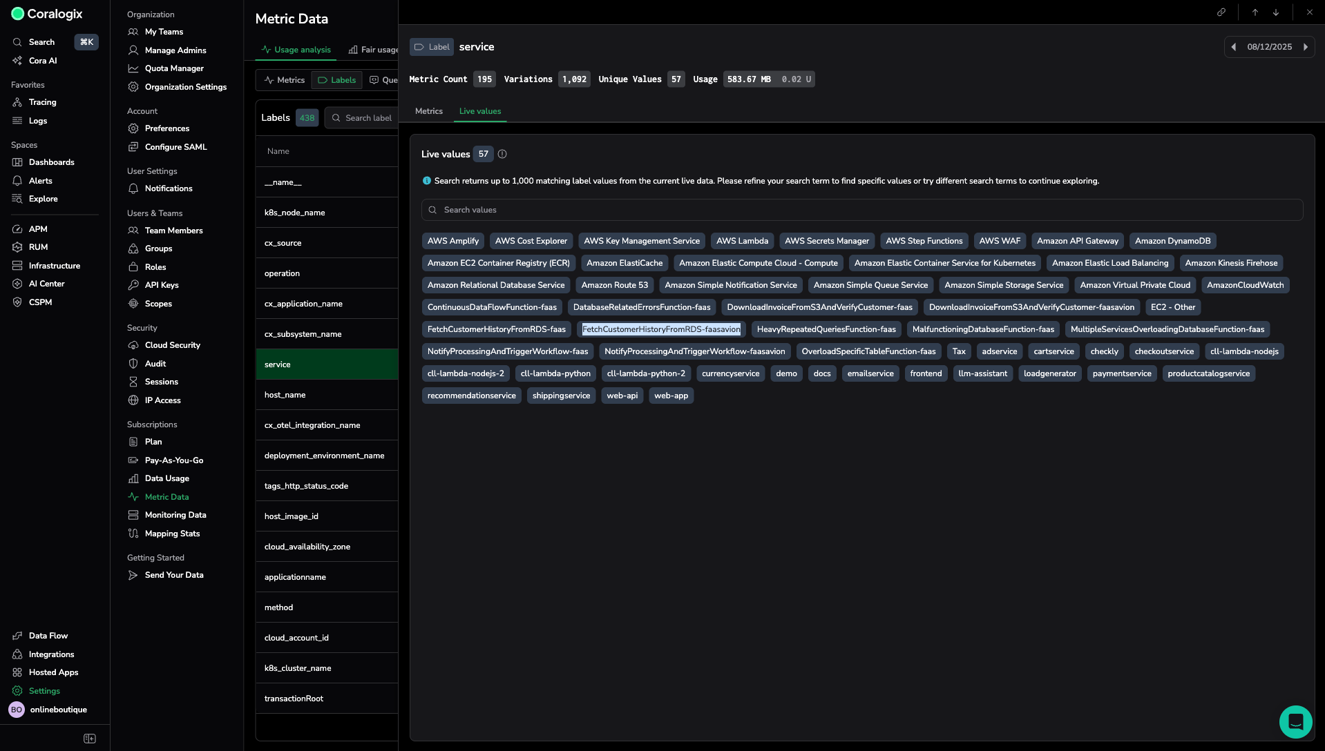 Example: Selecting the operation label lists metrics such as cx_service_catalog_service_duration_cx_bucket and latency_ms_sum, showing how each contributes to total usage.