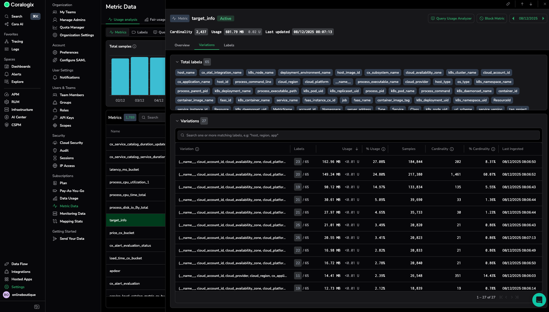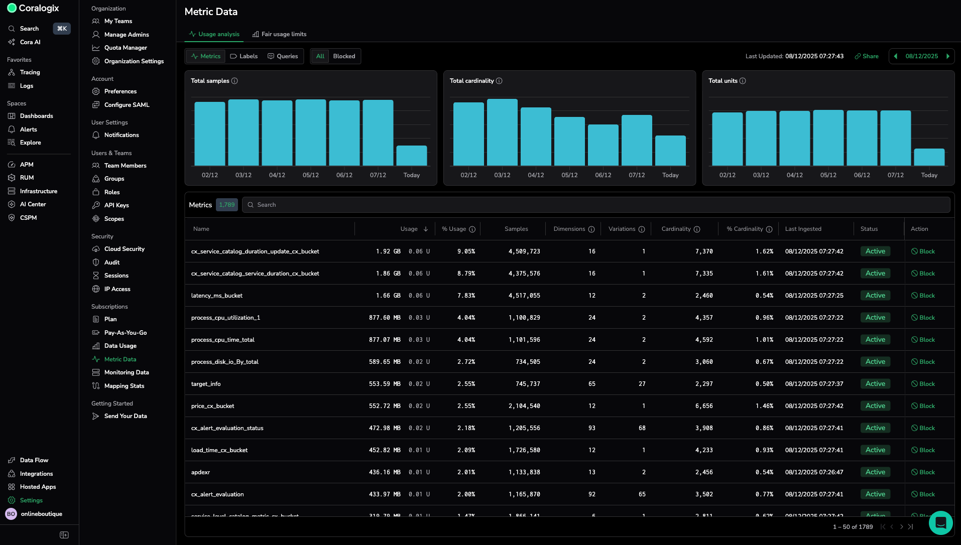 - Metrics: Ingested metrics with usage, cardinality, and samples