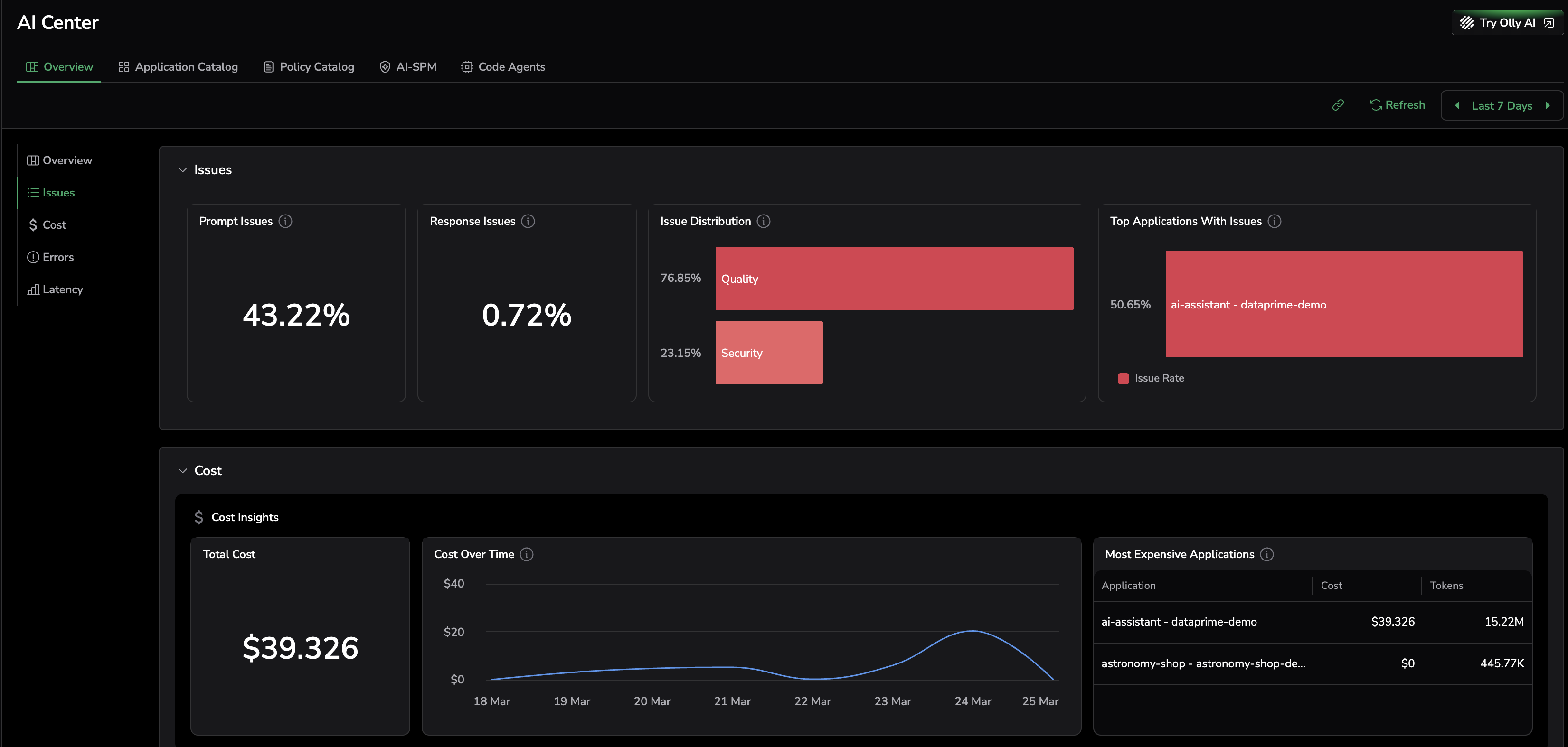 The AI Center Overview surfaces issue rates, prompt and response problem trends, and the applications generating the most issues across your organization.