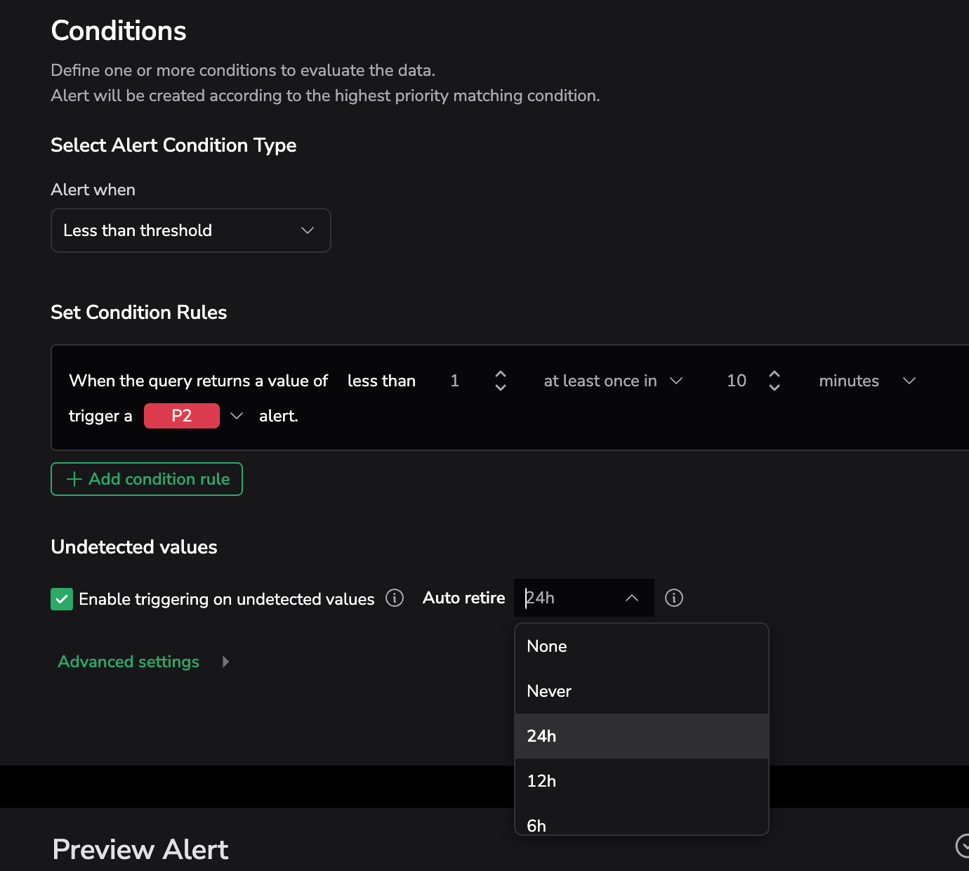 The Undetected values section appears only when you use a Less than operator. Undetected values occur when a metric label permutation stops sending data. Without safeguards, these gaps can trigger repeated alerts.