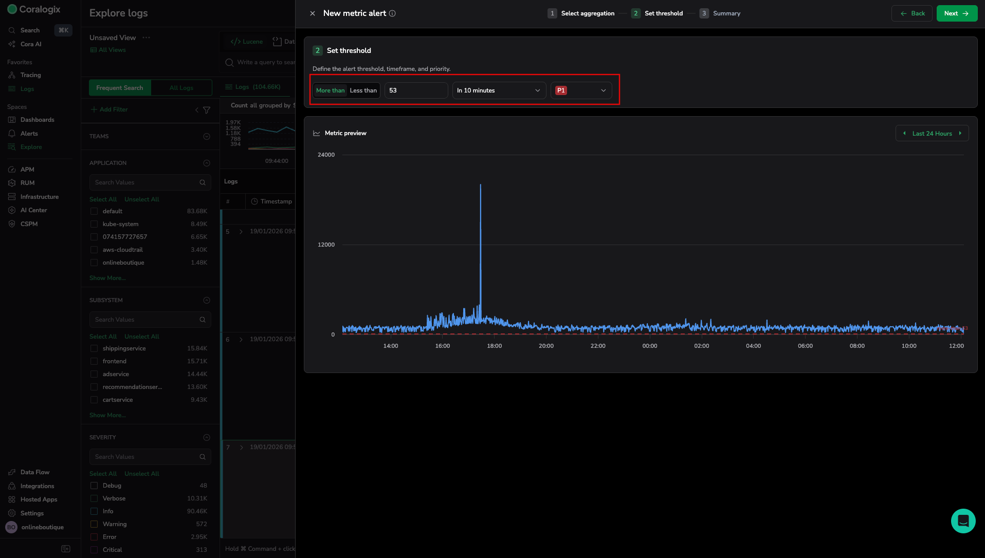 In the Set threshold step, tell Coralogix what “too slow” looks like.