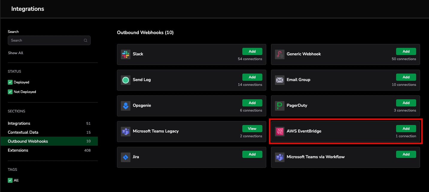 Modify or delete any of the webhook settings in the Actions column of the AWS EventBridge app. To add an alert to an existing webhook, click on the number under Associated Alerts.