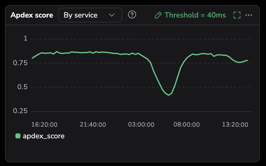 The threshold (T) is used to calculate Apdex and classify requests as satisfactory (≤ T), tolerated (> T and ≤ 4T), or frustrated (> 4T). For example, if T = 2 seconds, then 0–2s is satisfactory, 2–8s is tolerated, and ≥ 8s is frustrated. Apdex then produces a score from 0 to 1, where values closer to 1 indicate higher user satisfaction.