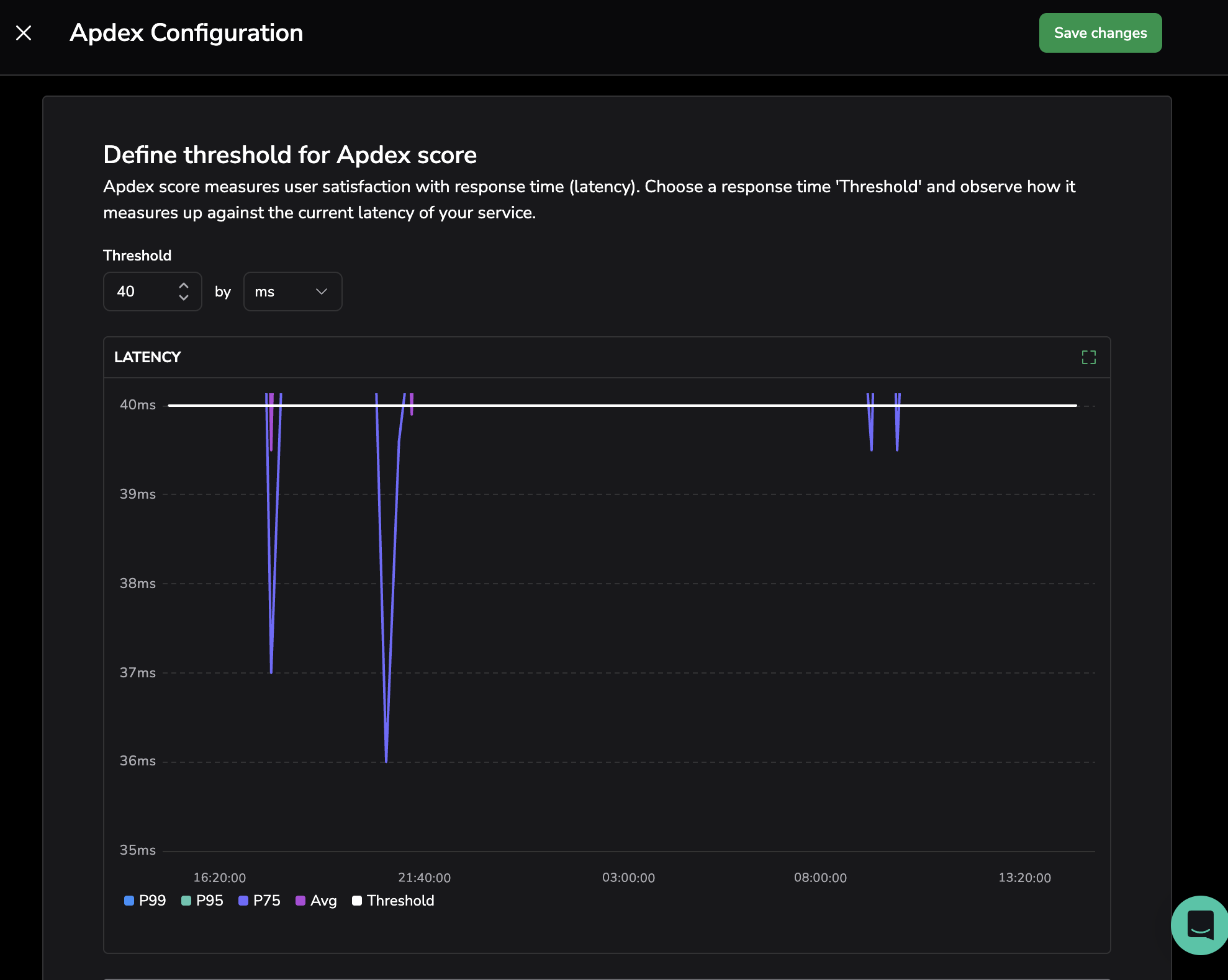 The Latency graph shows your selected threshold along with the P99, P95, P75 and Average latencies, enabling you to see how the threshold compares with the current latency of your service.