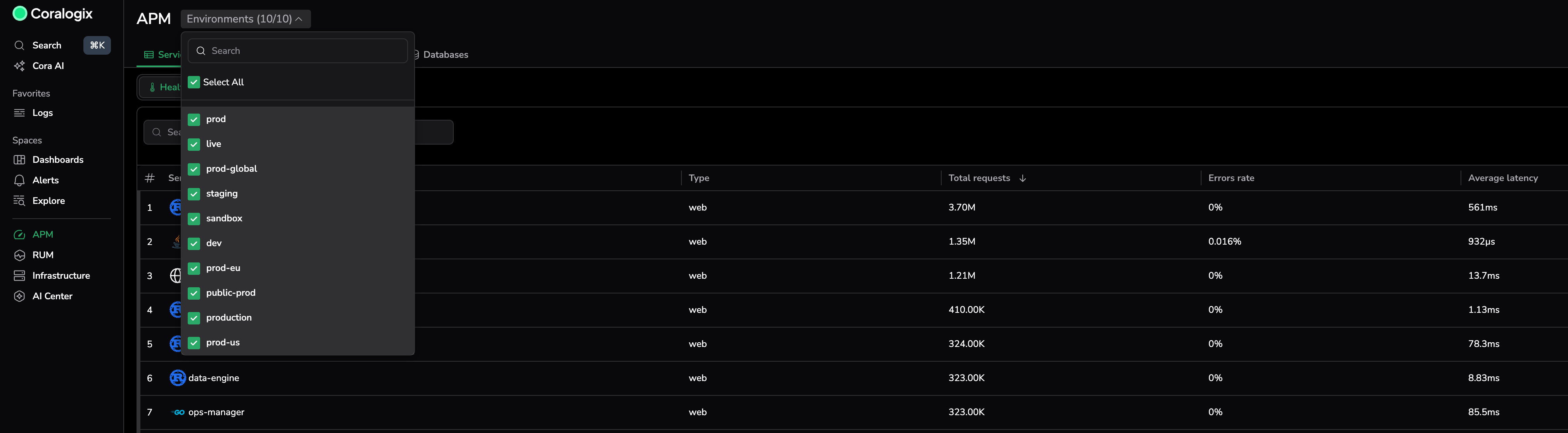 The Environment filter in APM provides an easy and consistent way to query, filter, and group APM telemetry data by environment (for example, dev, staging, or prod). It is available for Span Metrics users in both compact and full modes.