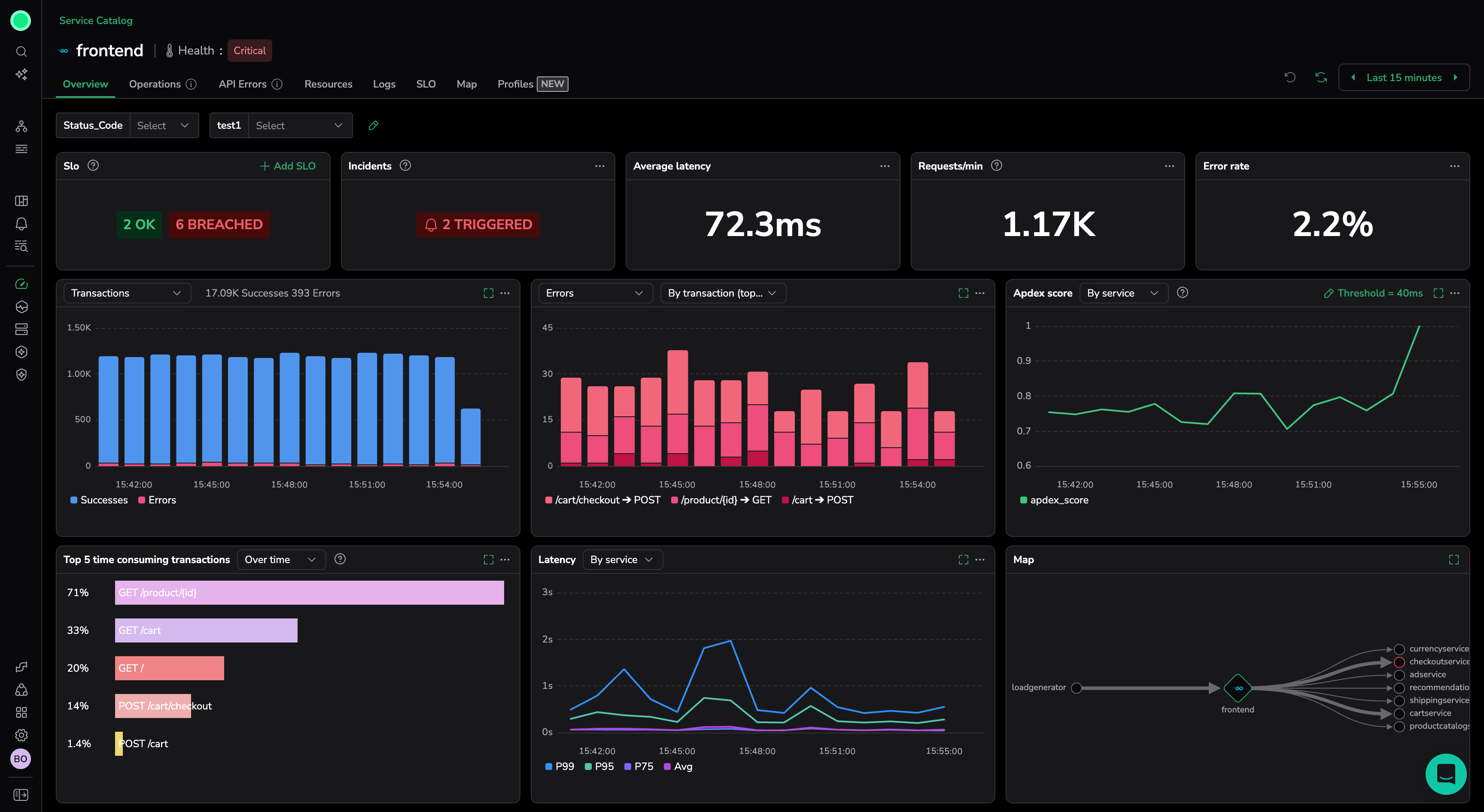 Apdex score: Displays the Apdex (Application Performance Index) score over the selected timeframe. The Apdex score is a standardized metric used to measure and quantify user satisfaction with the response time of software applications.