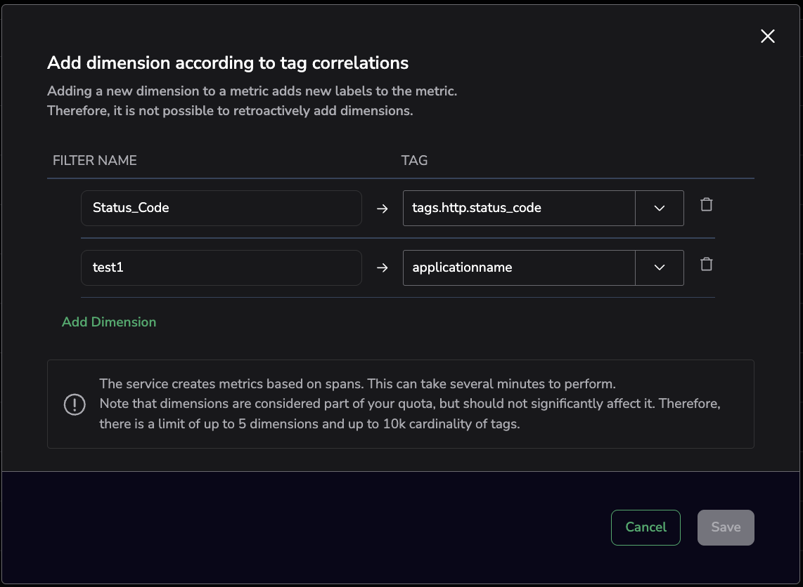 Dimensions create metrics from spans and are therefore considered part of your quota. Use a maximum of 5 dimensions, each of which can filter up to 10k labels (cardinality).
