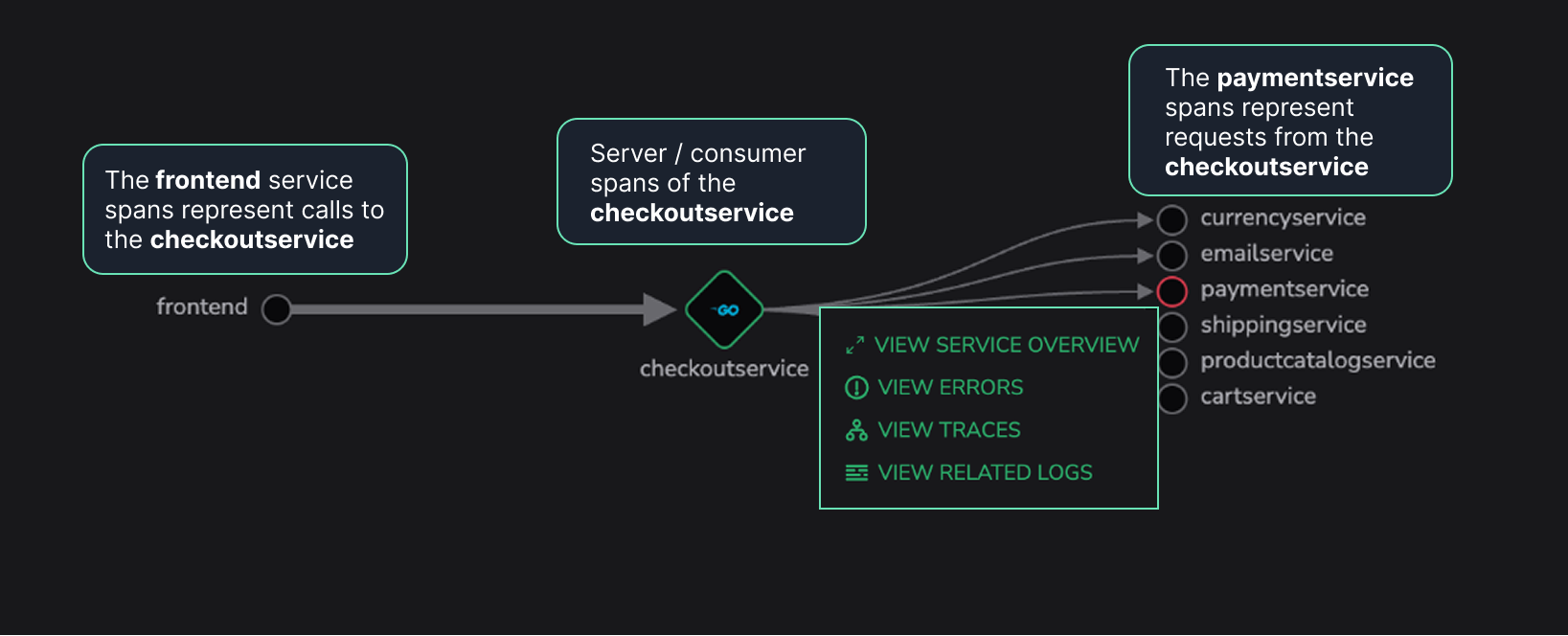 Latency between services is shown on the connecting lines, with line thickness indicating severity—the thicker the line, the higher the latency. If multiple services have an error rate above 0%, the one with the highest error rate is highlighted with a red outline. Hovering over a service displays a tooltip showing its throughput, error rate, and average duration relative to the central service. Selecting a service opens a context menu with options to view the Service Overview, its errors, traces, or related logs.
