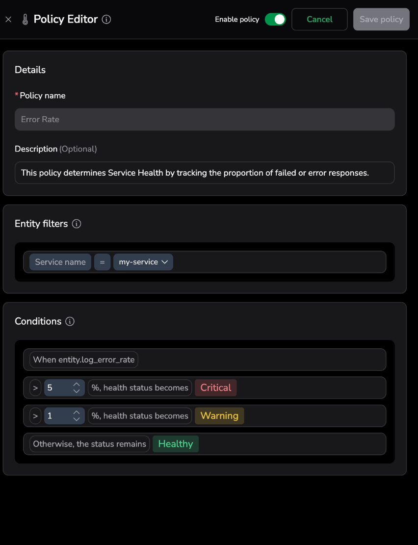 | Policy | A rule that determines a service’s health based on a specific data sources (for example, avg. latency or error rate). Each policy includes conditions that define when a service is considered Healthy, Warning, or Critical. |