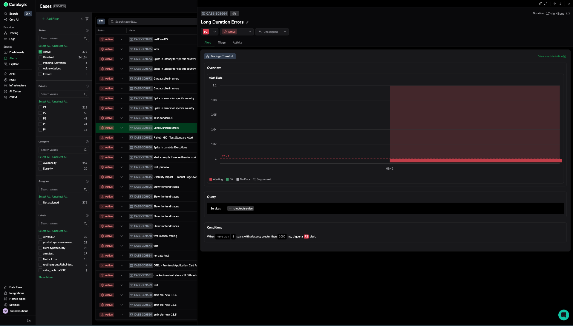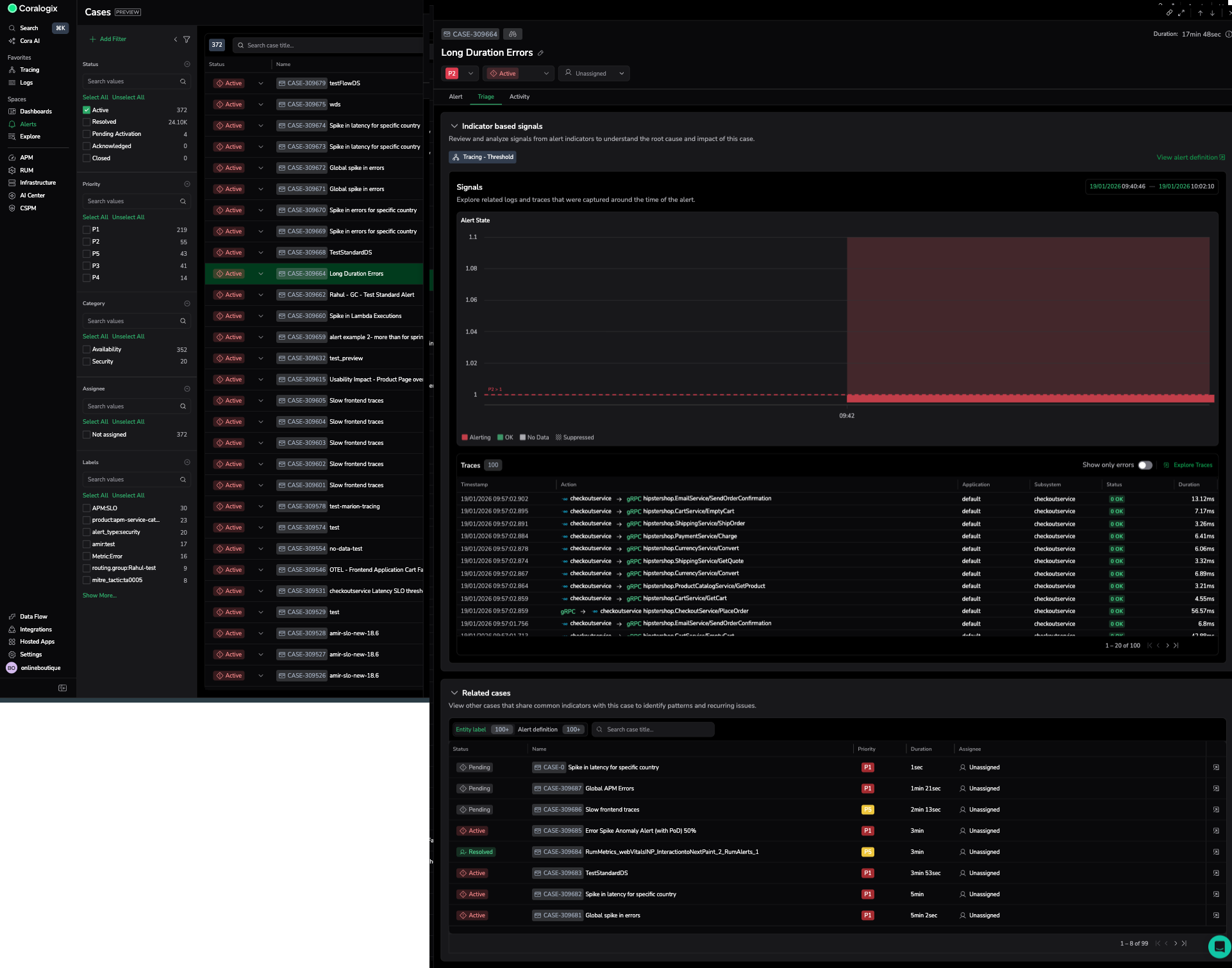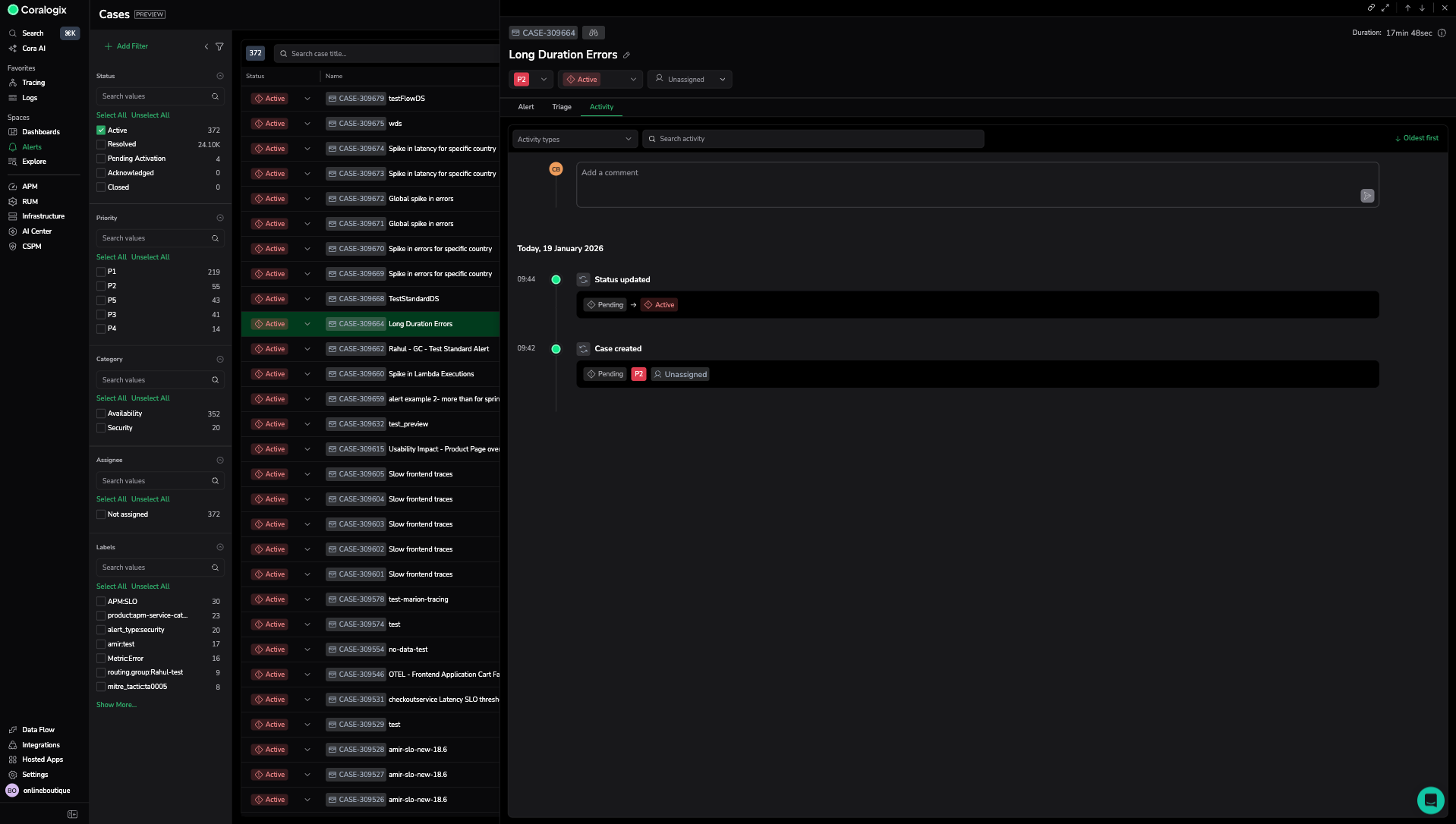 The Cases view brings together all triggered cases in one place. At present, Cases mirror your incidents, meaning each Case represents an event generated by an alert that has fired. This gives you a consolidated view of active and resolved alerts across your environment.