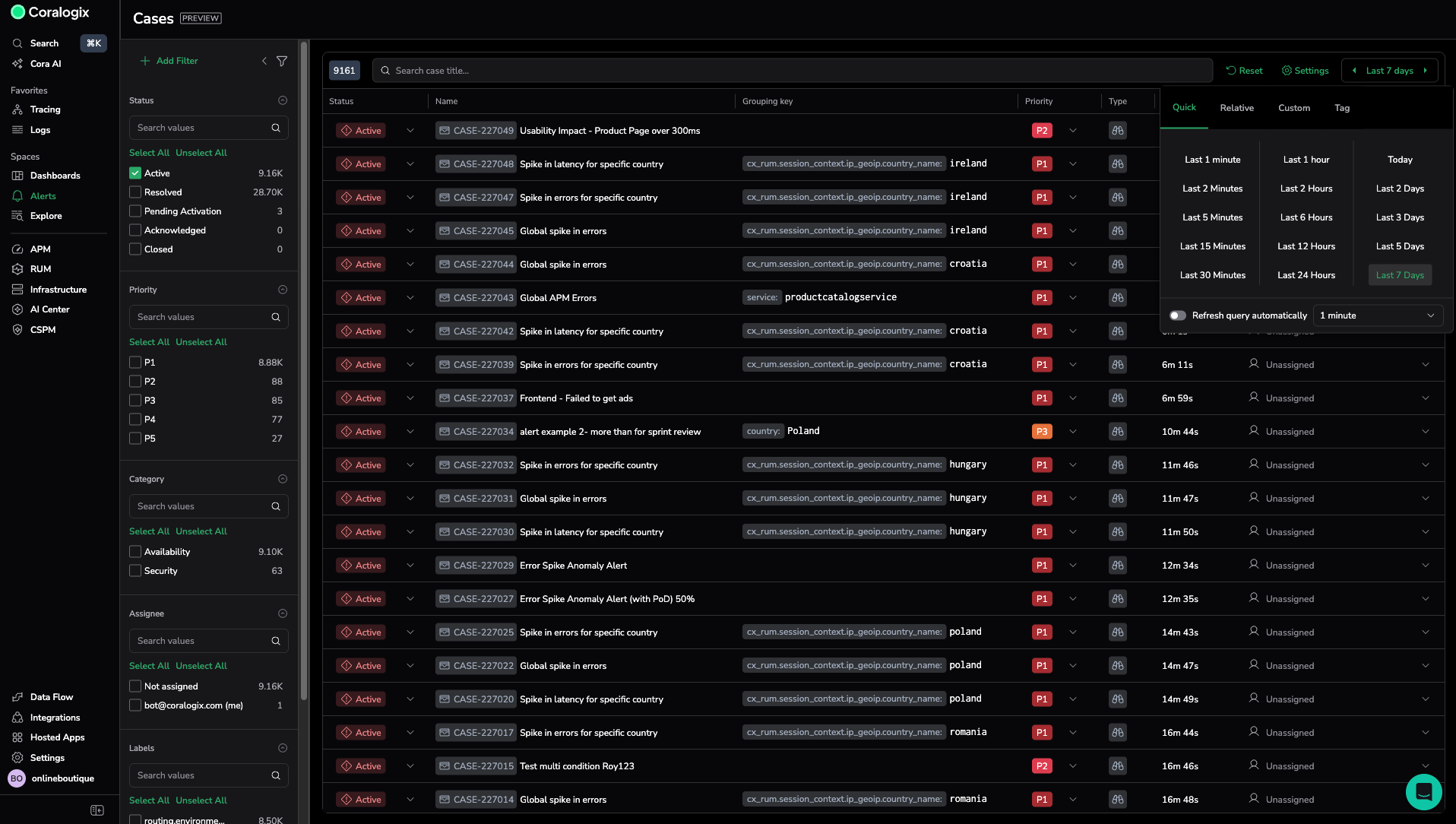 - Group-by tags: Labels such as service name, country, or pod name that help you spot patterns. Use these to identify whether multiple Cases are related or coming from the same source.