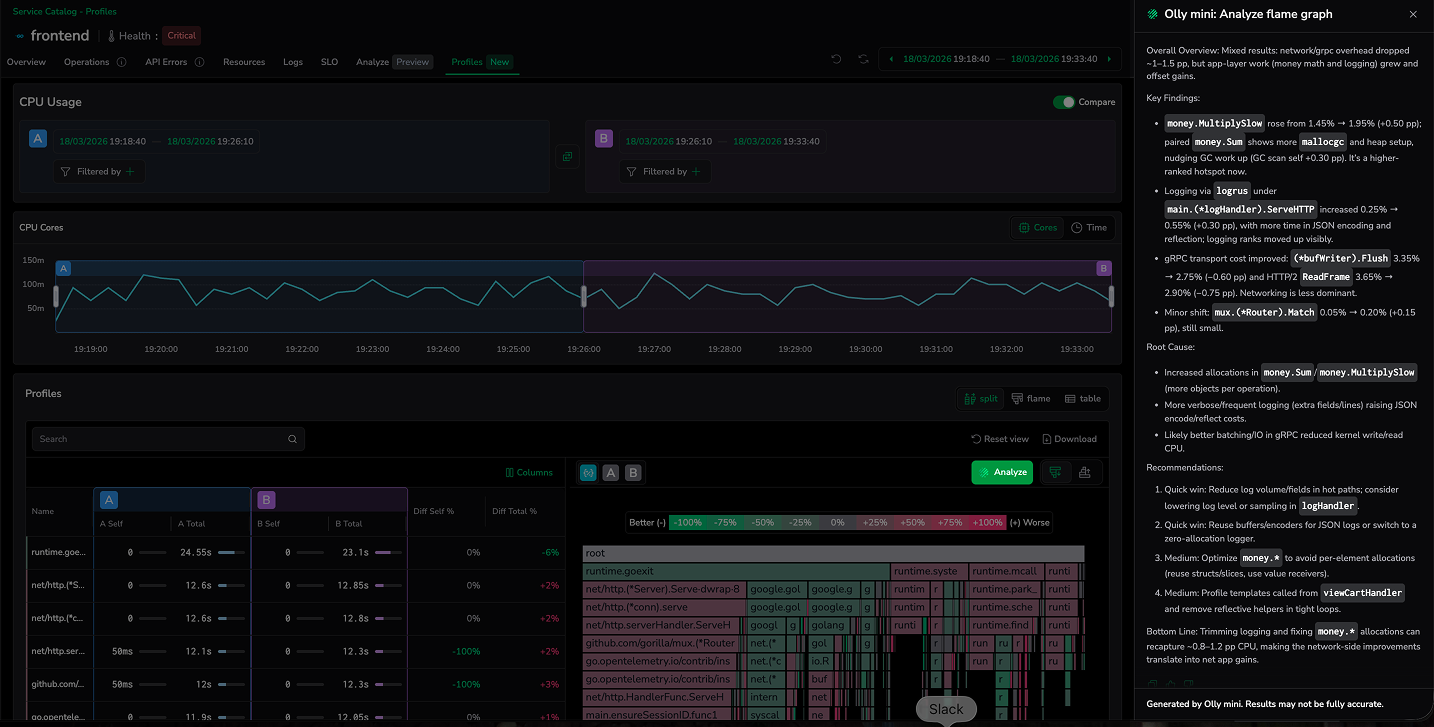 When you select Analyze in compare mode, Olly examines the diff flame graph and identifies: