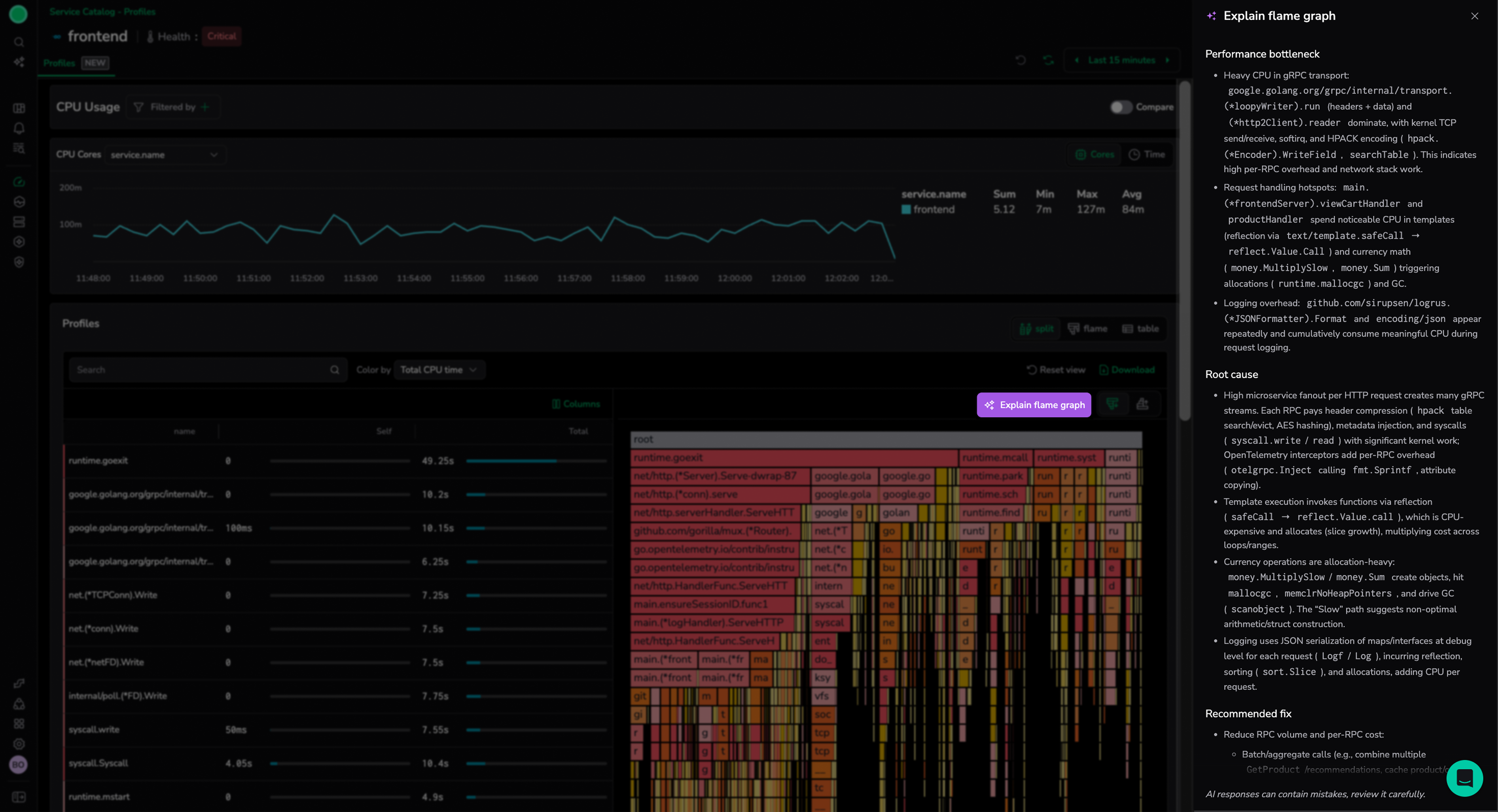 If CPU time is increasing steadily, your service might have inefficiencies that need optimization. On the other hand, sudden spikes or dips can signal an issue such as inefficient garbage collection, unexpected traffic loads, or code regressions. Once you’ve detected when and how CPU consumption changes, use the stack trace visualization to dig deeper and find which functions are driving high CPU usage.