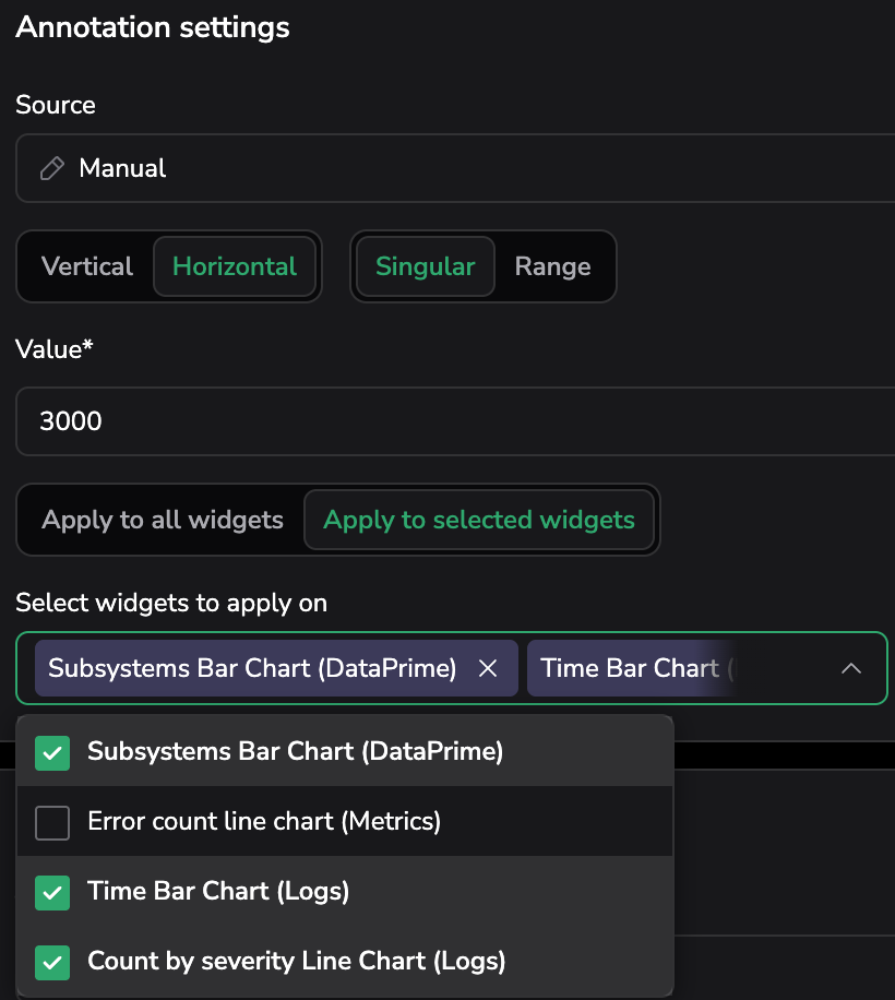 - Apply annotations to all relevant widgets in a dashboard or only to selected widgets.