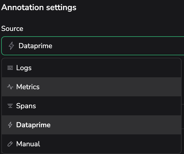 For query-based sources (logs, metrics, spans, DataPrime), annotations appear when data in your system matches the query. Each time the dashboard refreshes, the annotation is redrawn based on the latest matching results.