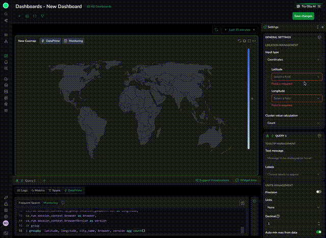 Configure the Input type to Latitude and Longitude or AWS Region and set the Cluster value calculation to Count. Add optional query filters such as severity , responseStatus, error_message