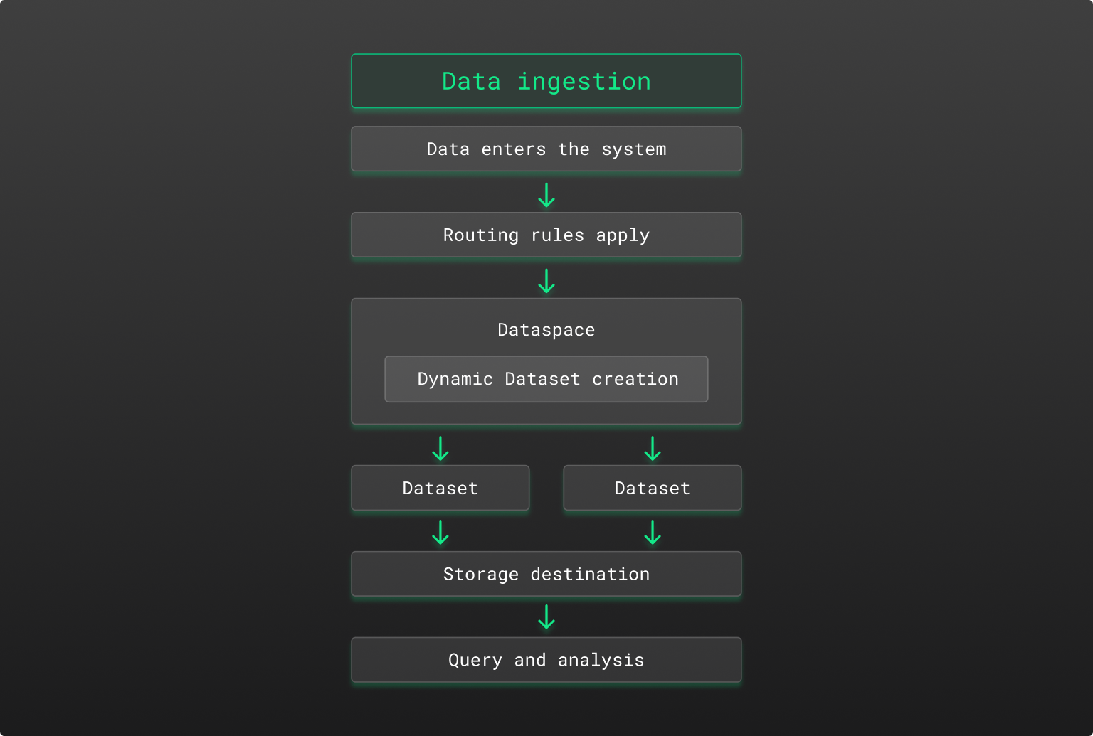 The TrafficProcessor applies routing rules to determine the appropriate dataset and dataspaces. For example, routing events to