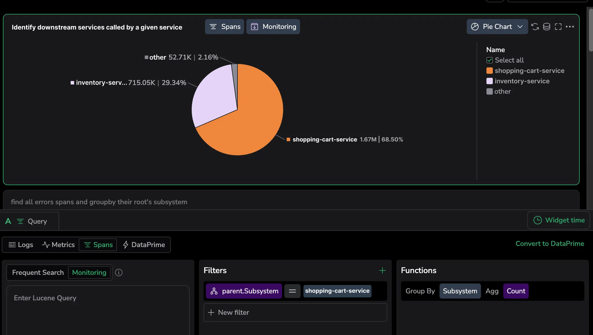 See all spans whose parent belongs to a specific service (for example, shopping-cart-service) and visualize the distribution of downstream calls.