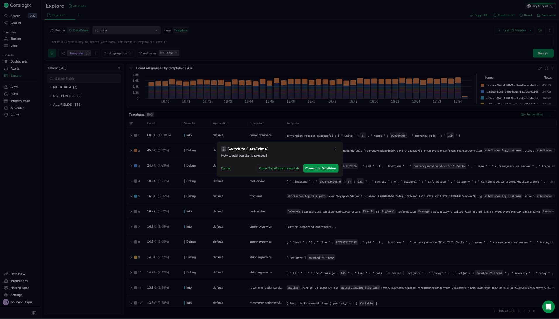 - In the query bar area, select DataPrime to switch from Builder mode to DataPrime mode.