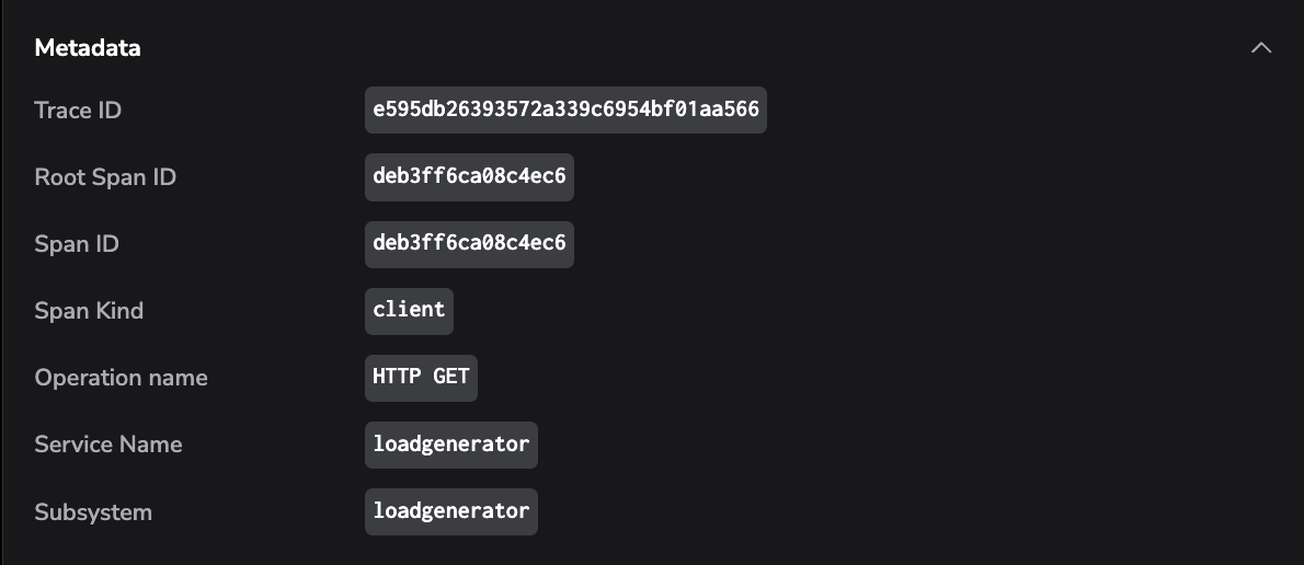 In Coralogix, span metadata is composed of span fields and tags. The Info Panel brings this metadata together in one place. It provides a structured, searchable source of truth for a selected span, including identifiers, timing, errors, type-specific attributes (HTTP, DB, messaging, and so on), and the full set of user-driven tags — so you do not need to switch between multiple views while troubleshooting.
