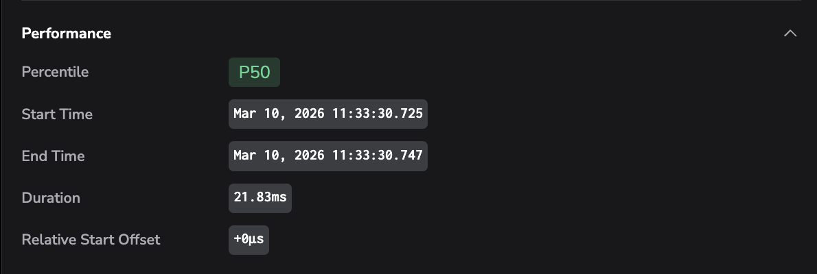- Duration percentile (p50 / p90 / p95 / p99 compared to similar spans)