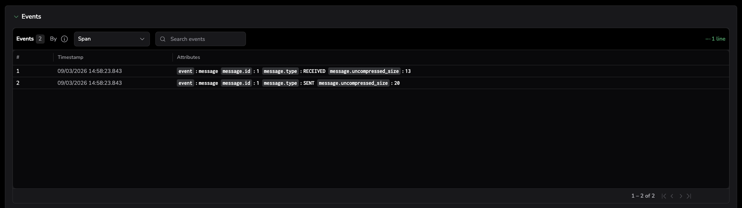 Use this tab to understand "What changed or what occurred during this span/trace" (for example, domain events, operational events, or meaningful attributes captured during execution).