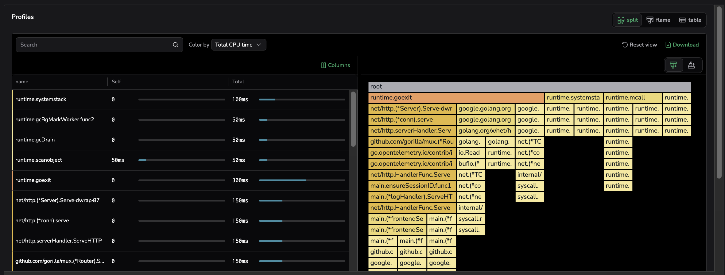 - Inspect profiles (for example, Split/Flame/Table views, depending on what’s enabled).