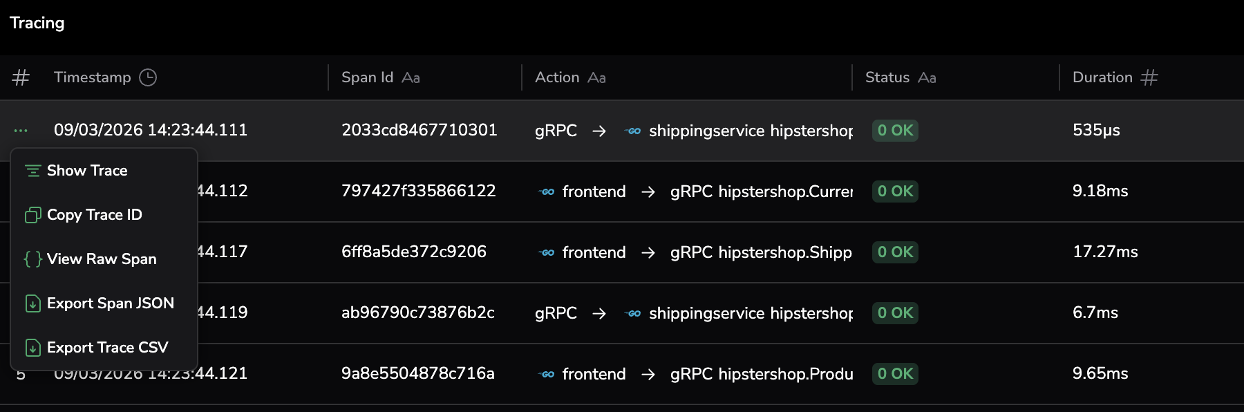With Tracing, you can follow every request across services, identify latency issues, troubleshoot bottlenecks, and correlate traces directly with logs—all in a streamlined, visual workflow. This allows teams to move quickly from high-level symptoms to precise root causes, even in complex, distributed environments.